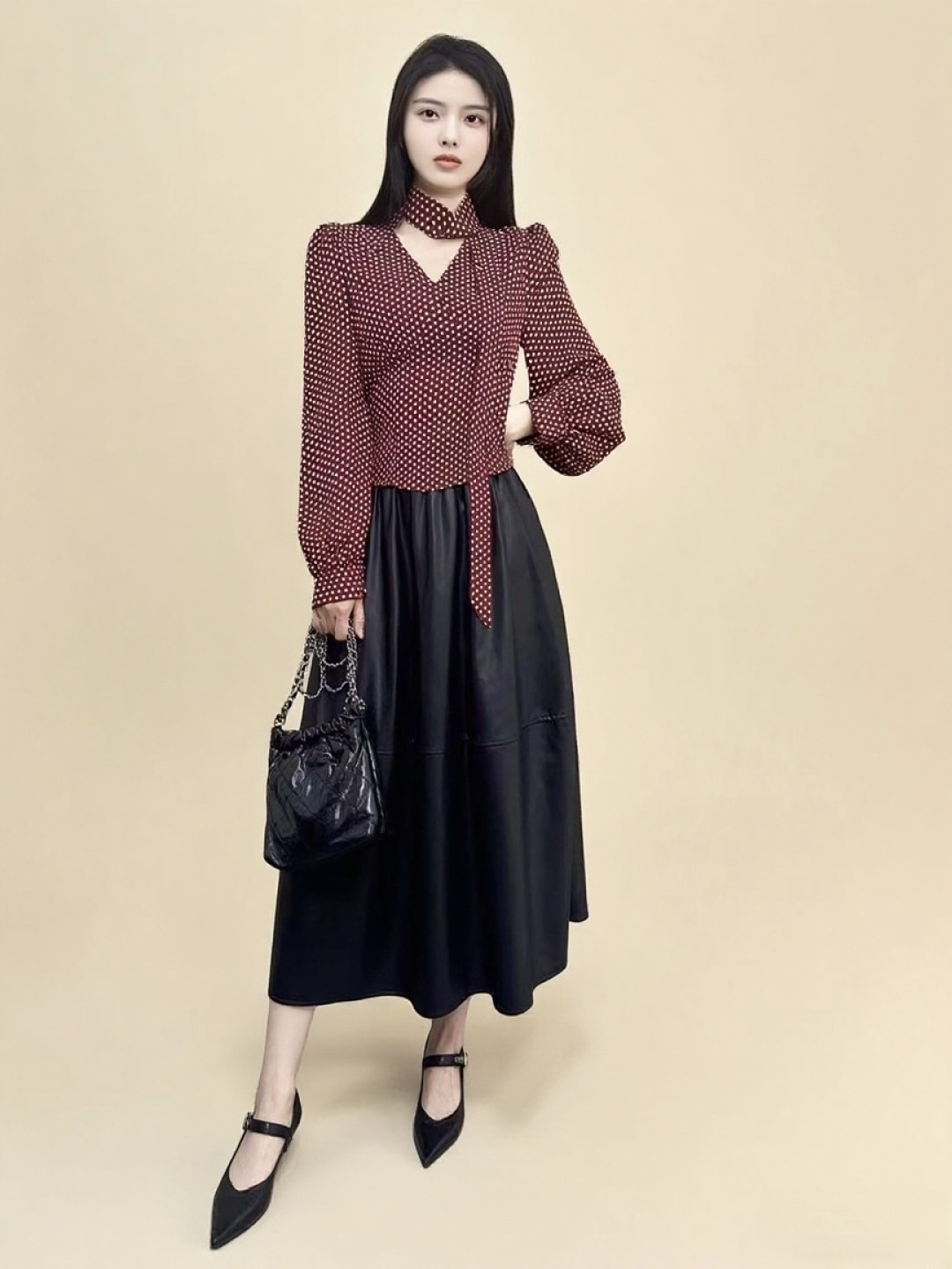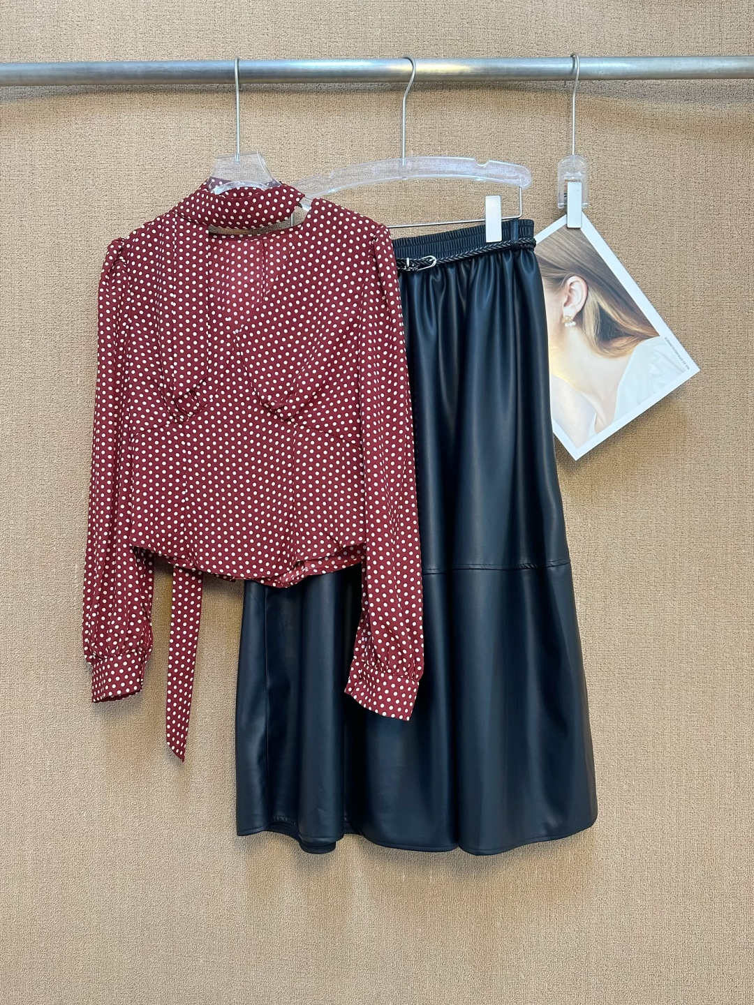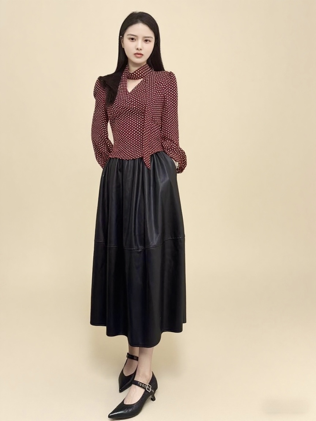 Embrace retro chic with this polka dot blouse and leather midi skirt. A versatile ensemble for a unique, eye-catching style.