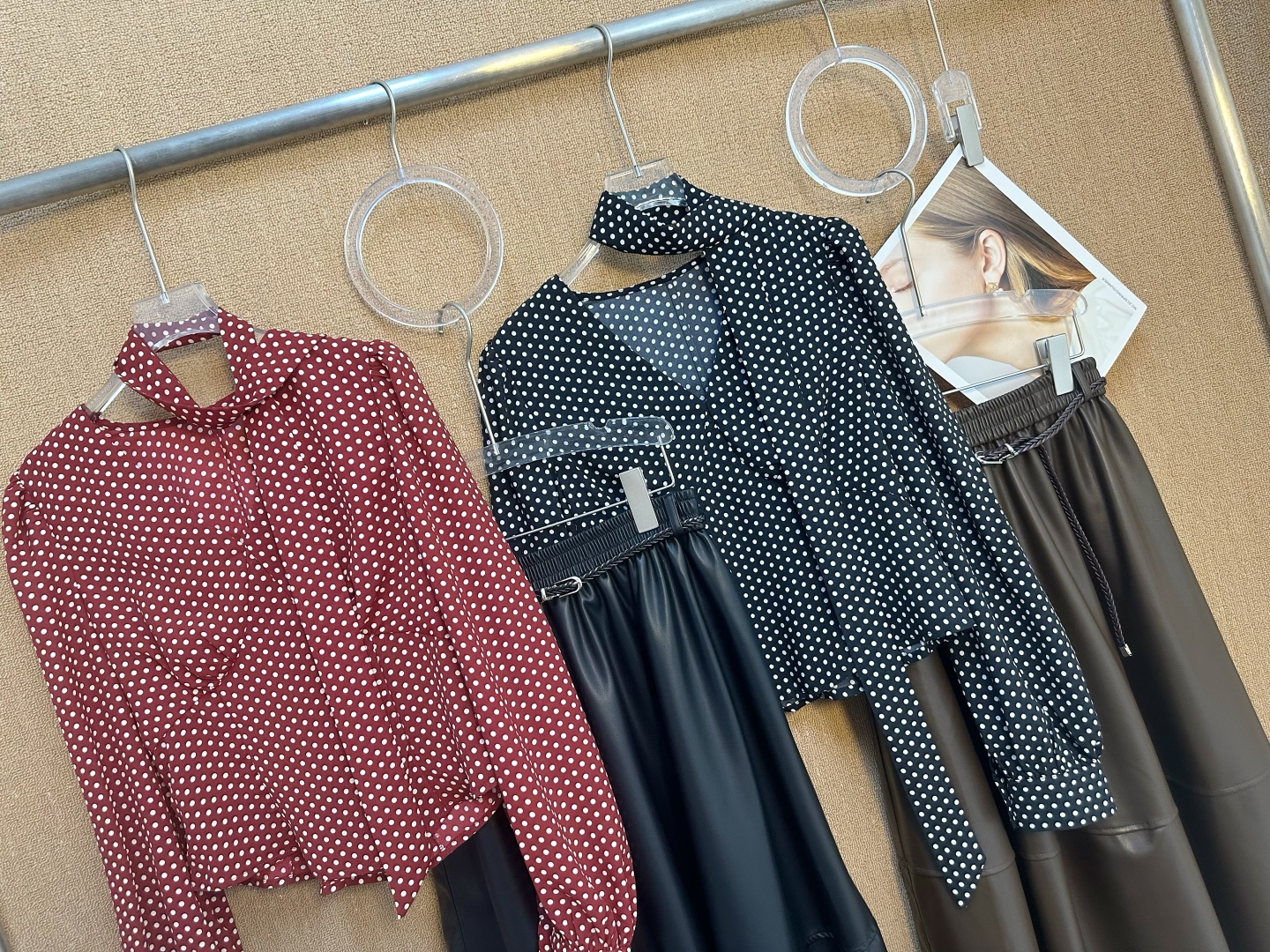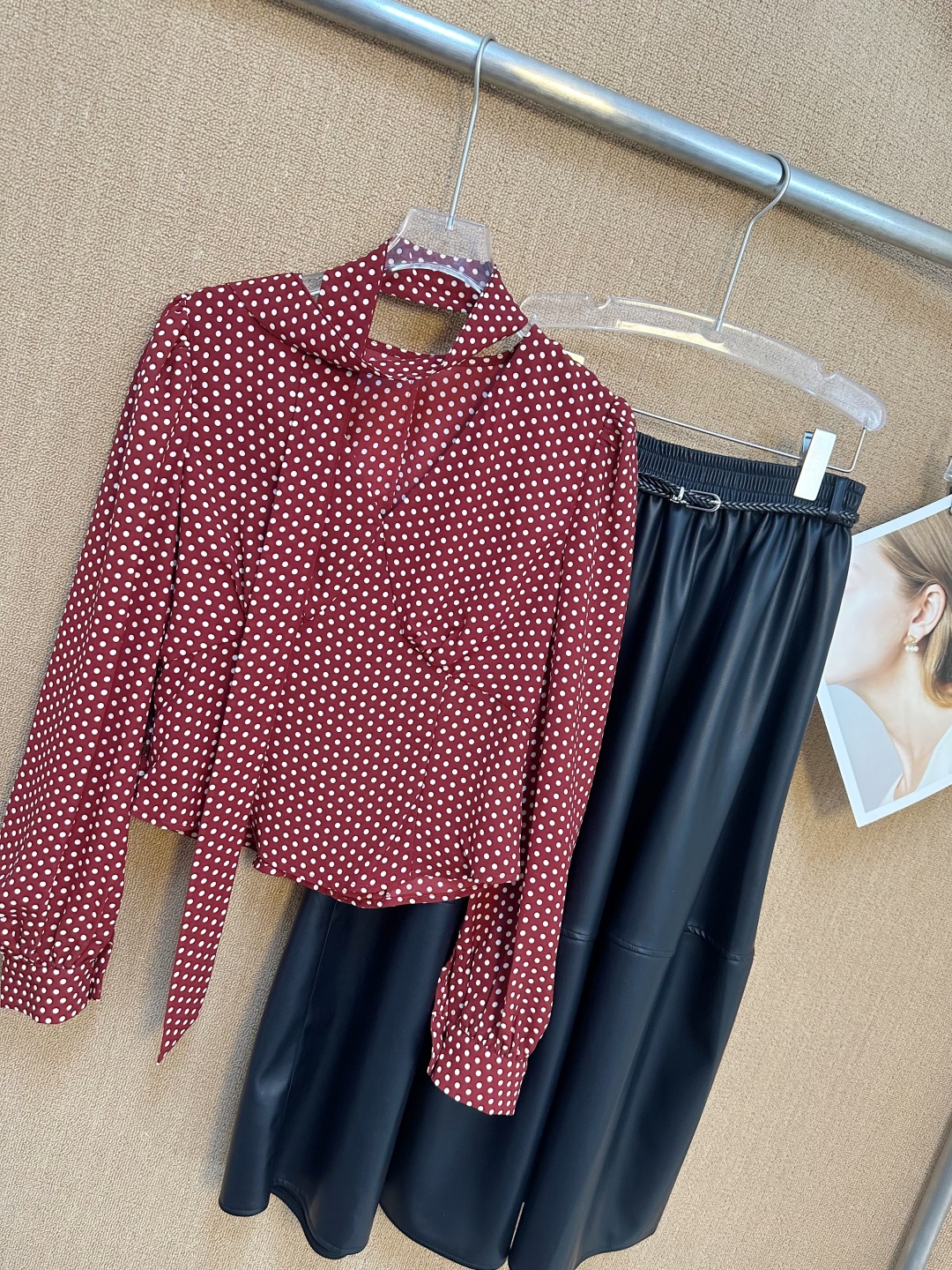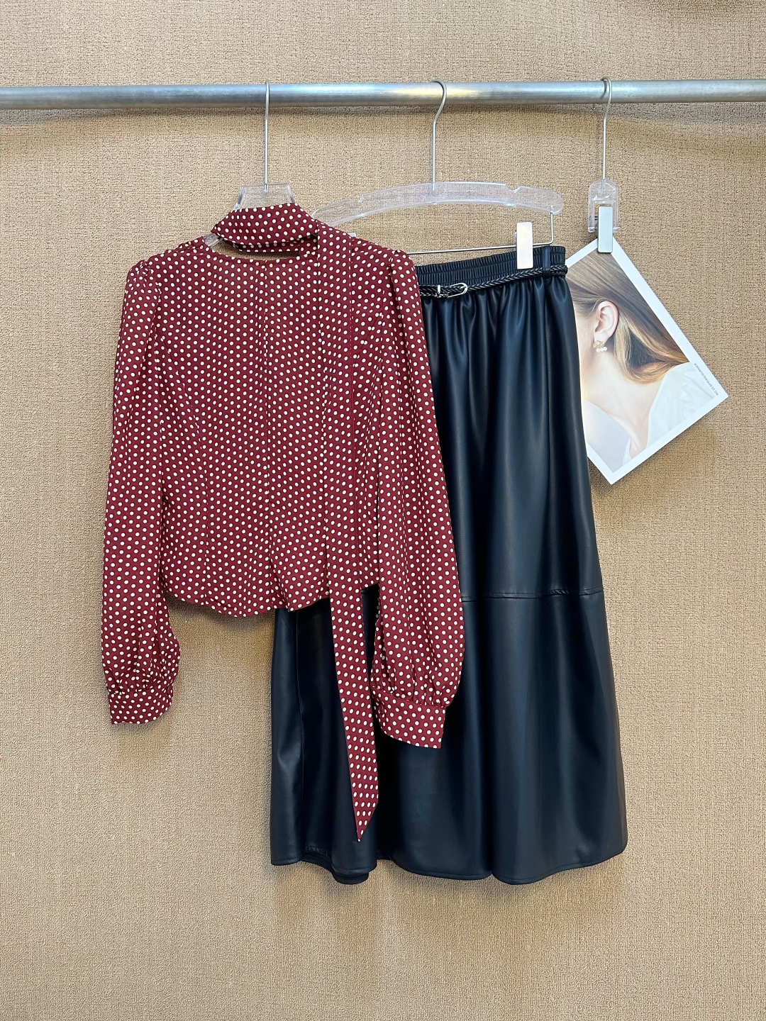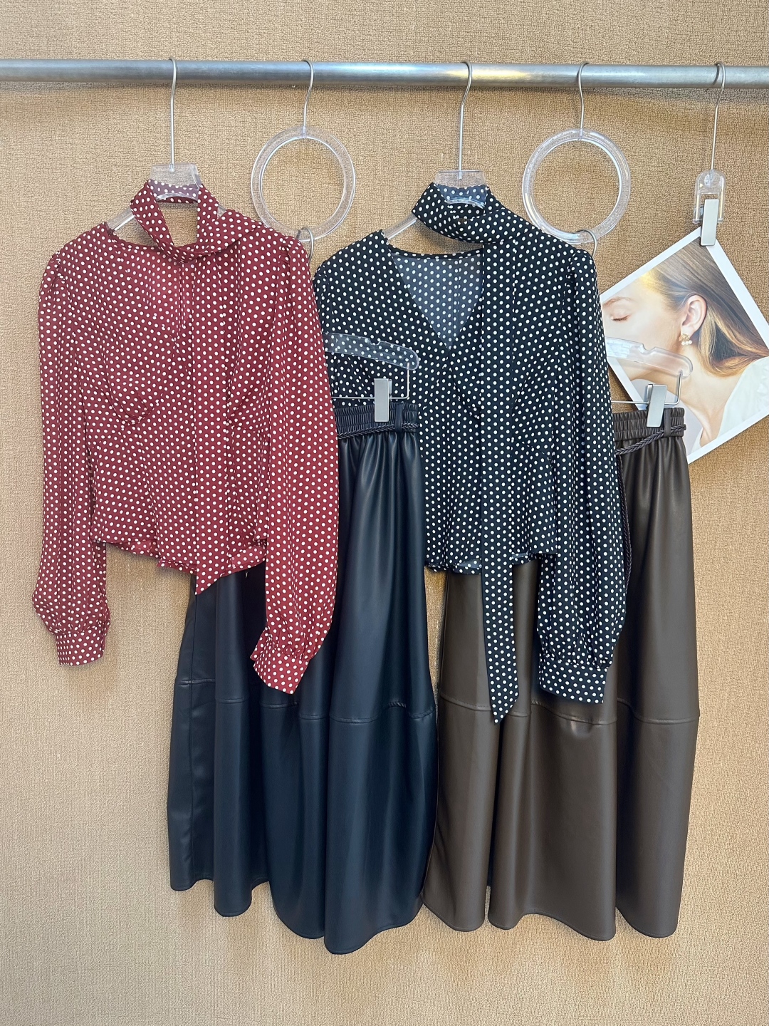 Embrace retro chic with this polka dot blouse and leather midi skirt. A versatile ensemble for a unique, eye-catching style.