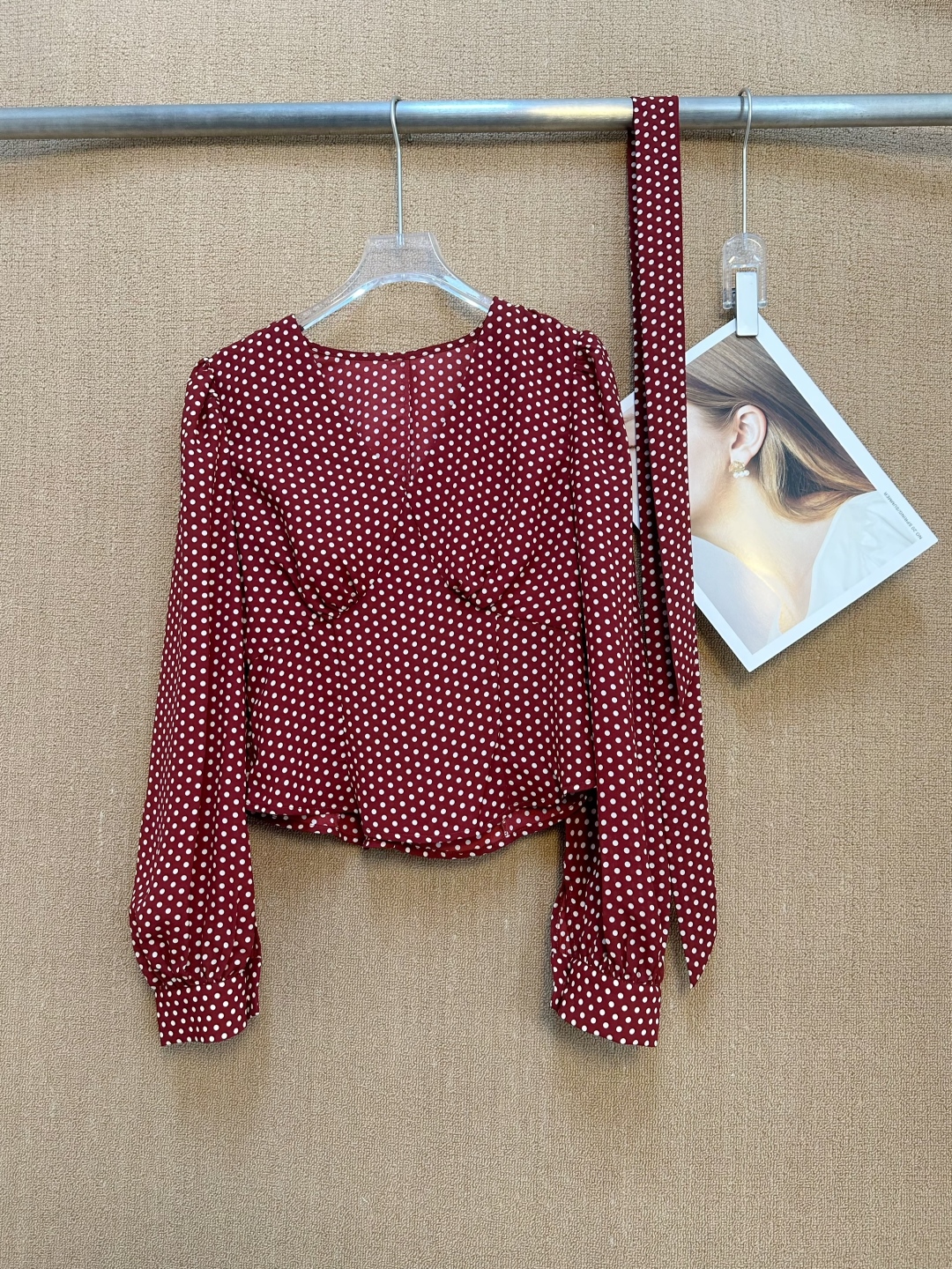 - Blouse: A red polka dot blouse with long sleeves and a unique neck tie design.