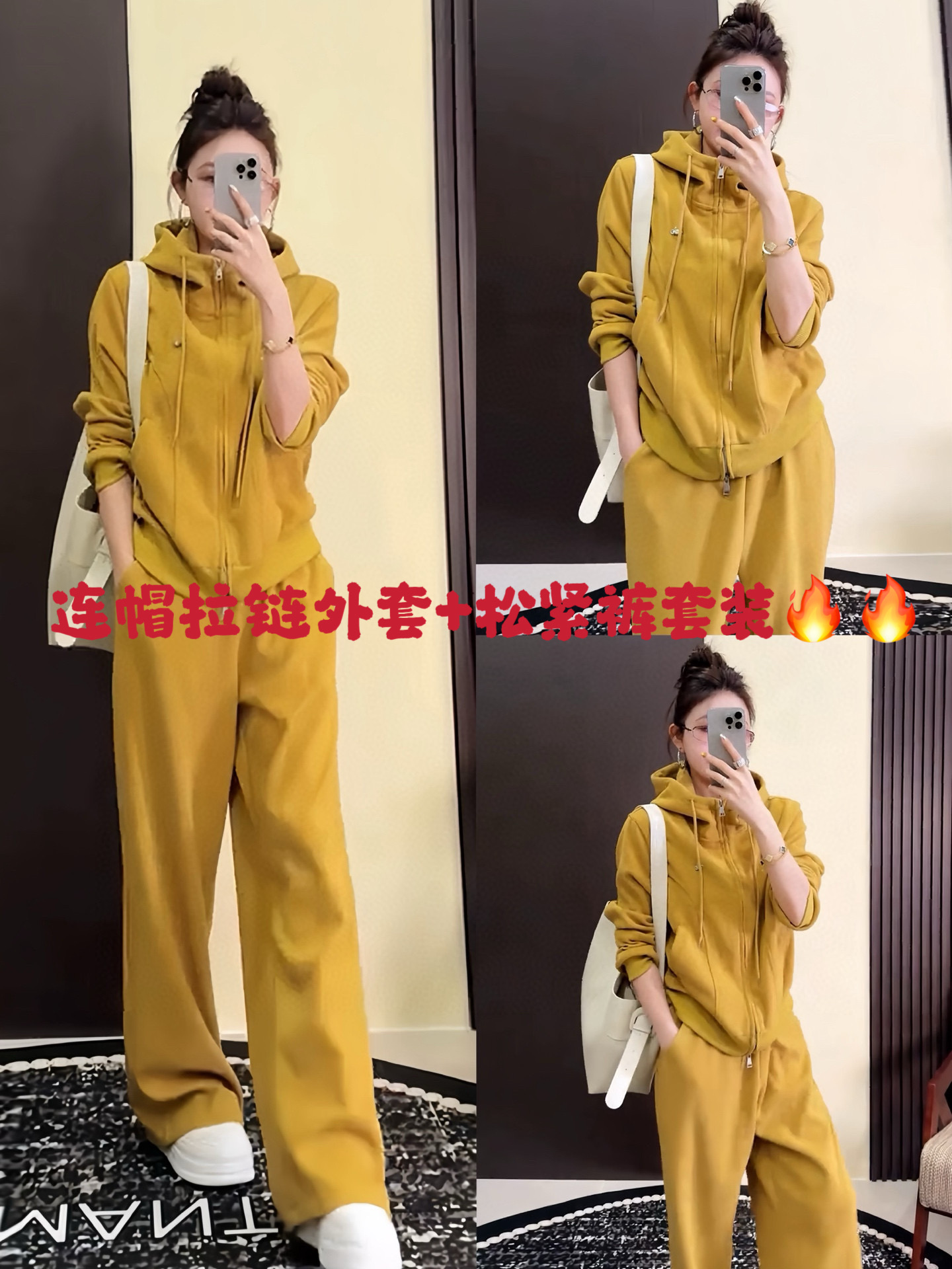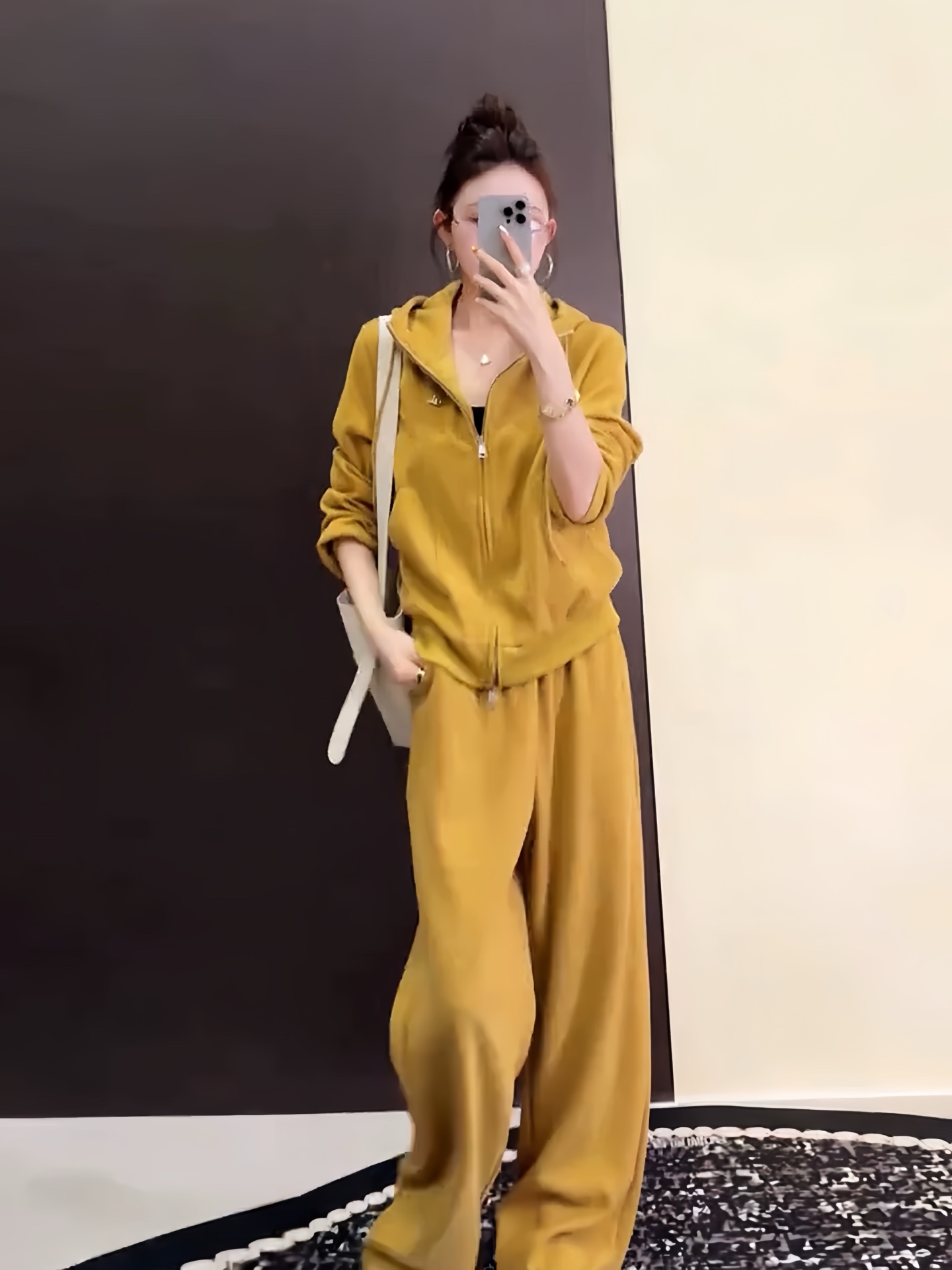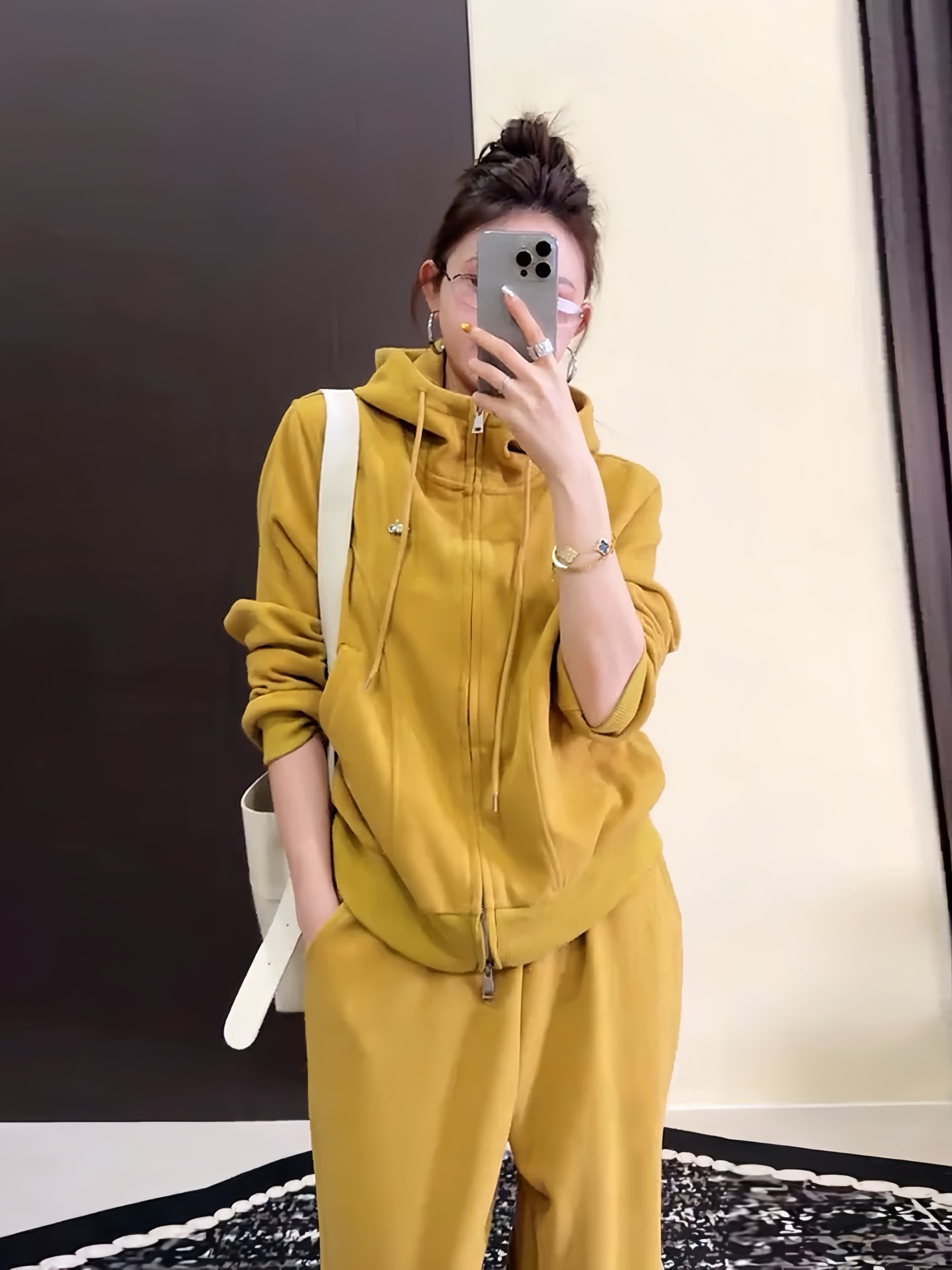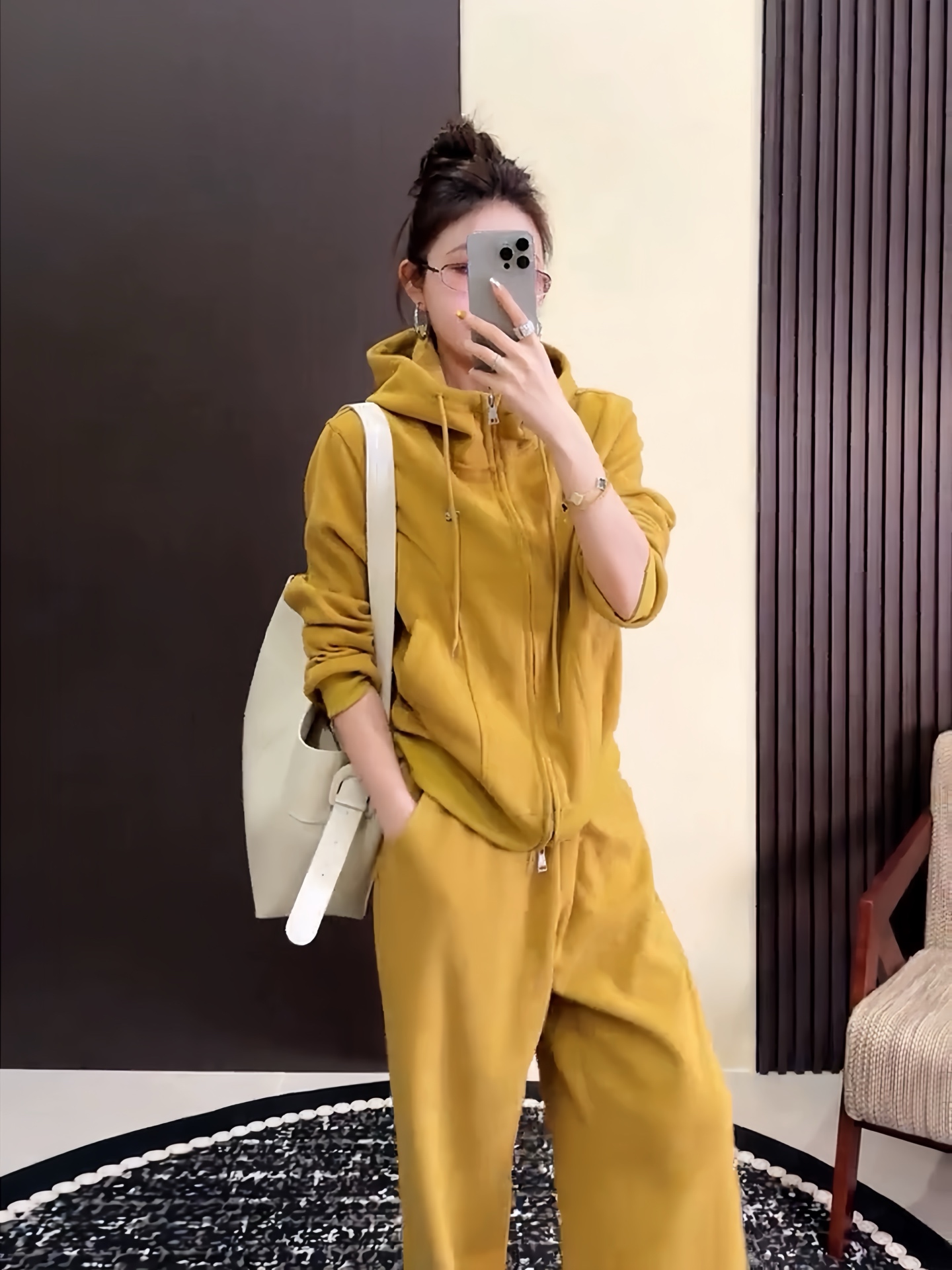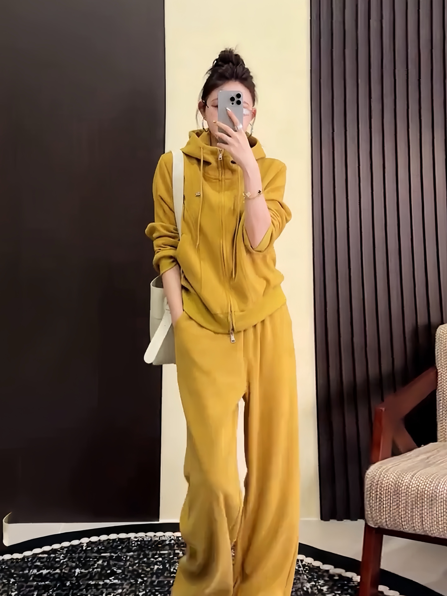 Elevate your loungewear with this chic wool blend tracksuit. Features a zip-up hoodie and wide-leg pants for a relaxed, stylish fit.