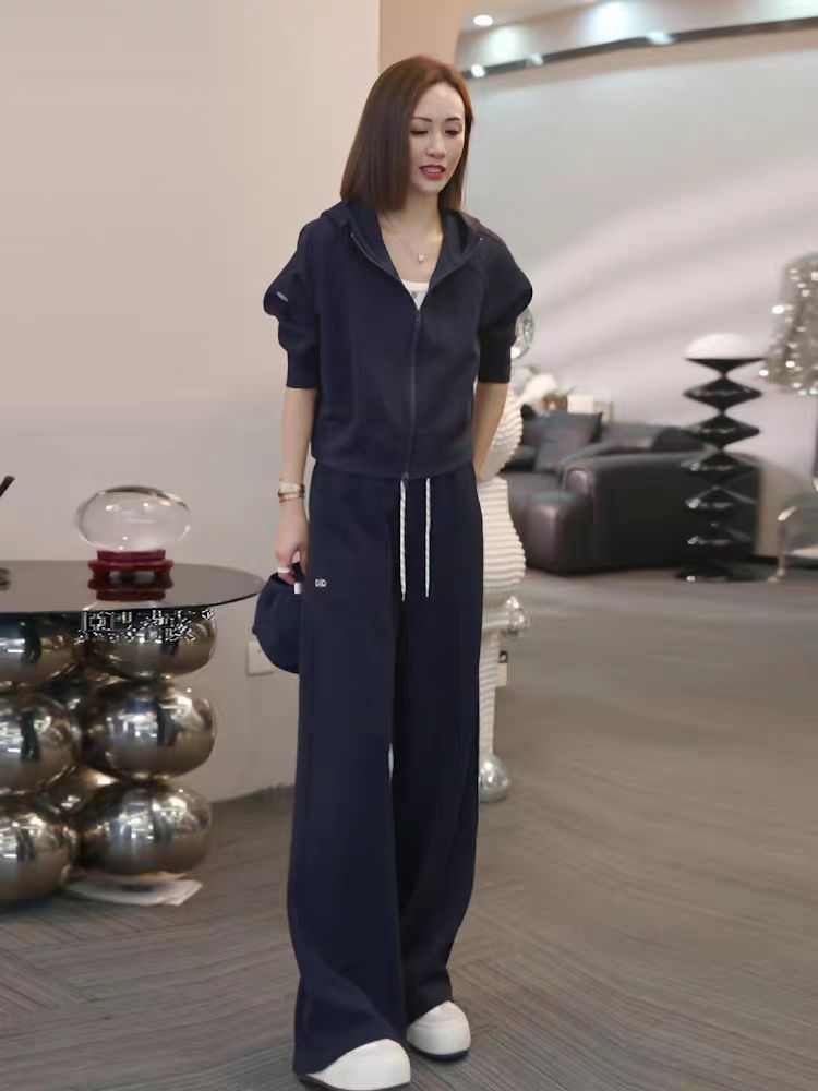 Stay stylishly comfortable in this navy blue two-piece set featuring a zip-up hoodie and straight-leg pants. Perfect for casual wear!