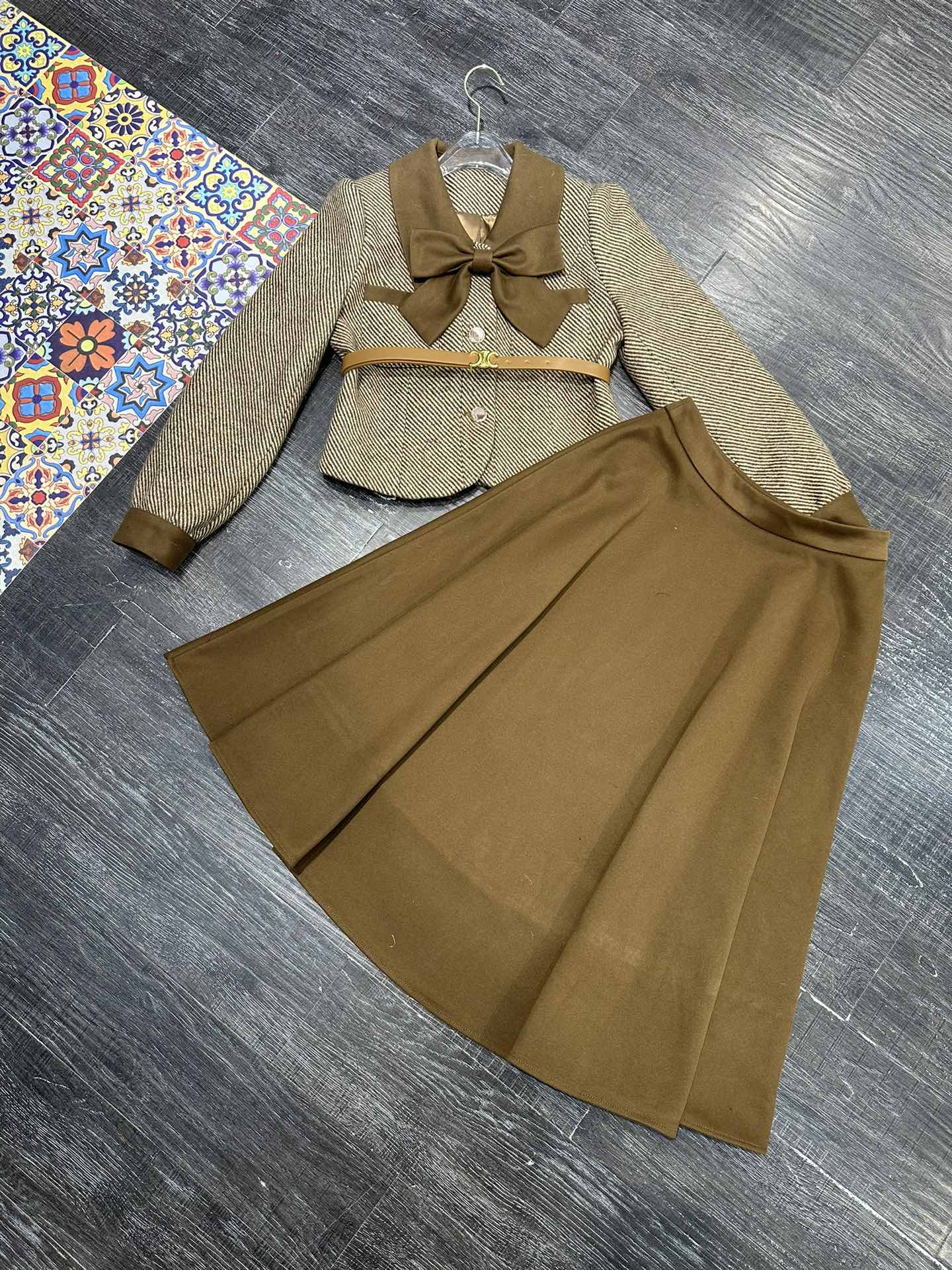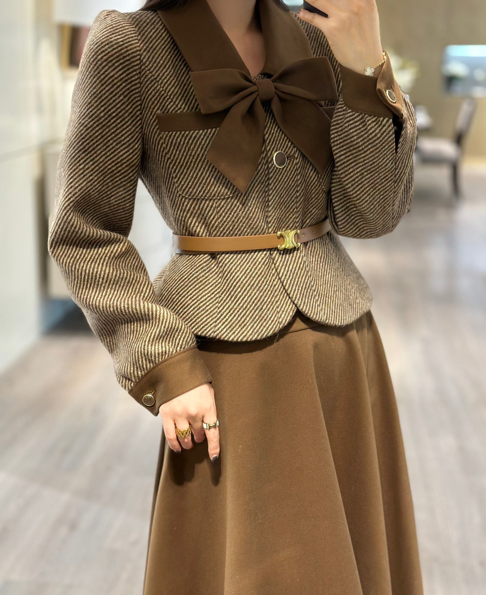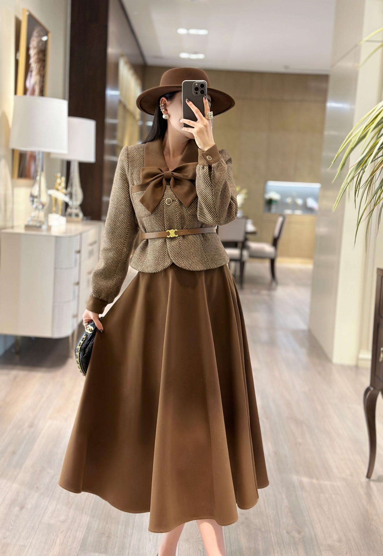 Women's Elegant Brown Blazer and Midi Skirt Set with Bow Detail, Retro Style