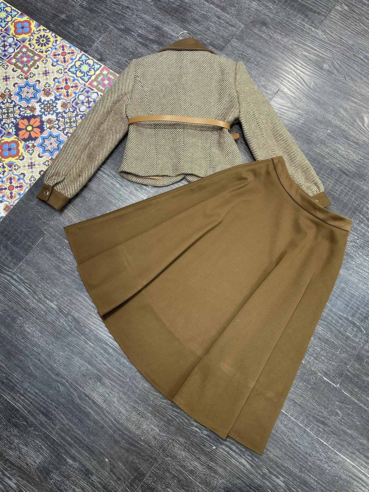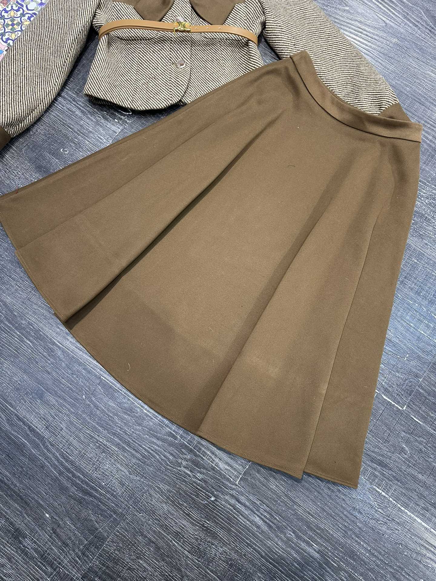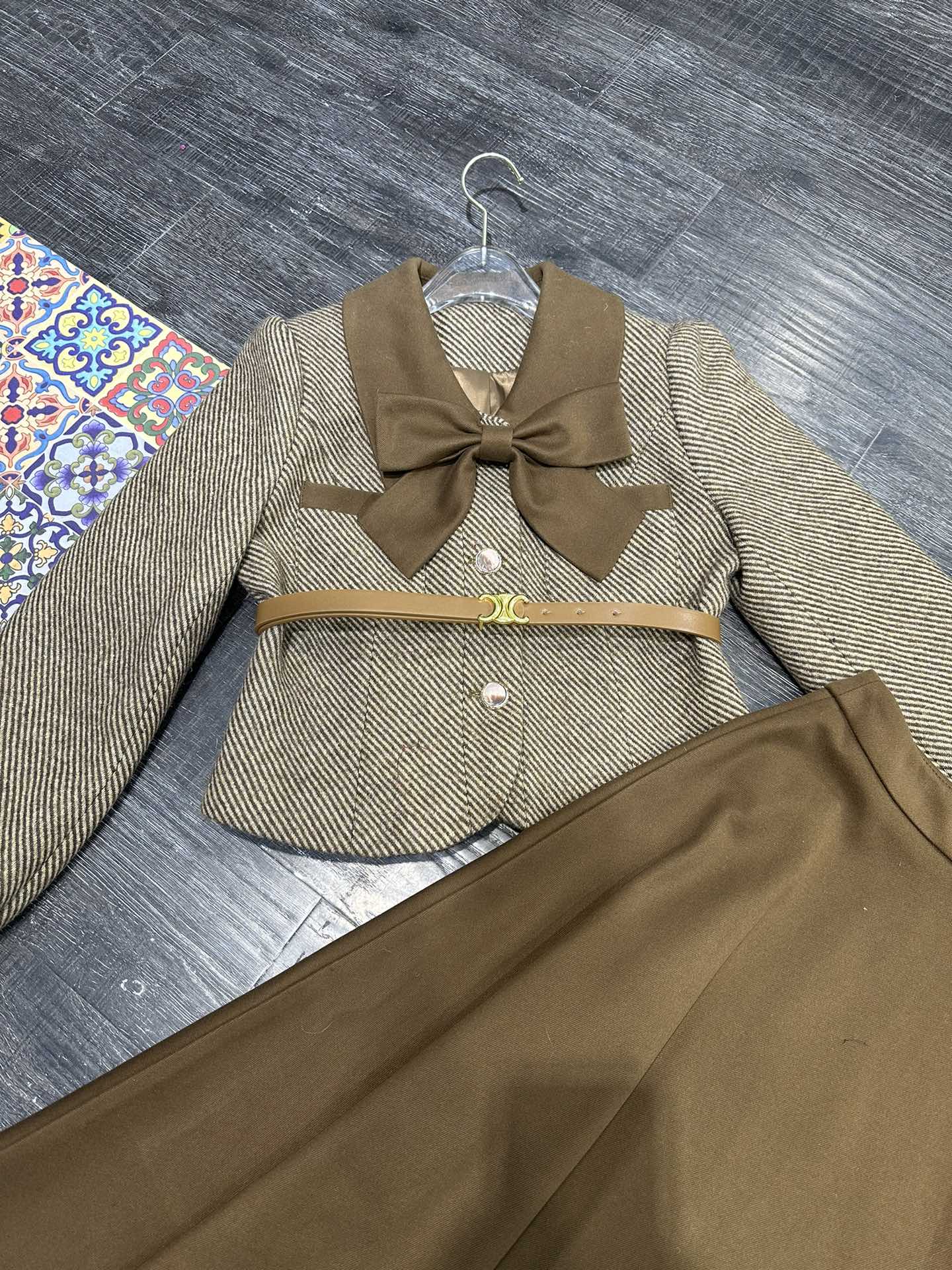 Women's Elegant Brown Blazer and Midi Skirt Set with Bow Detail, Retro Style