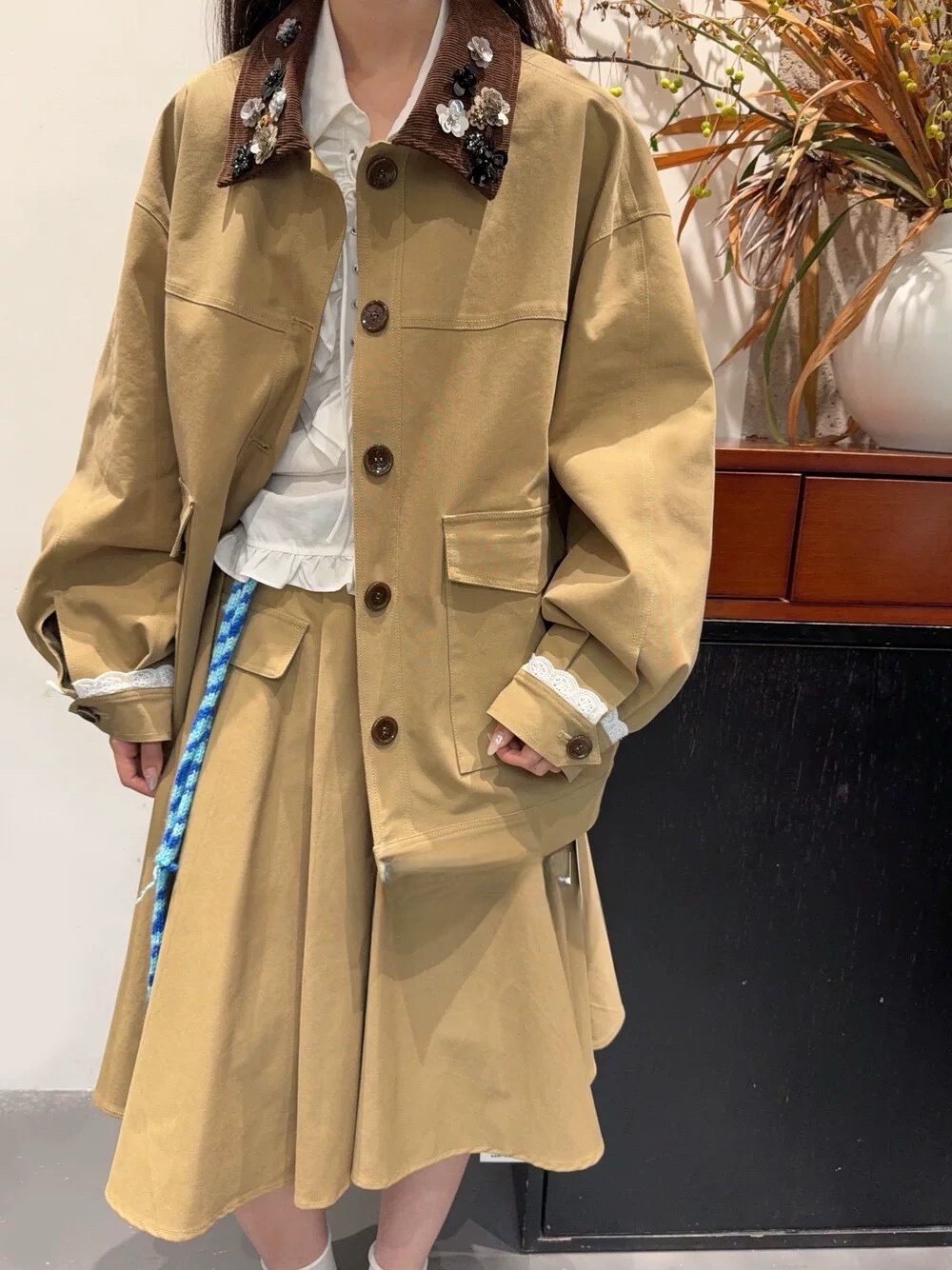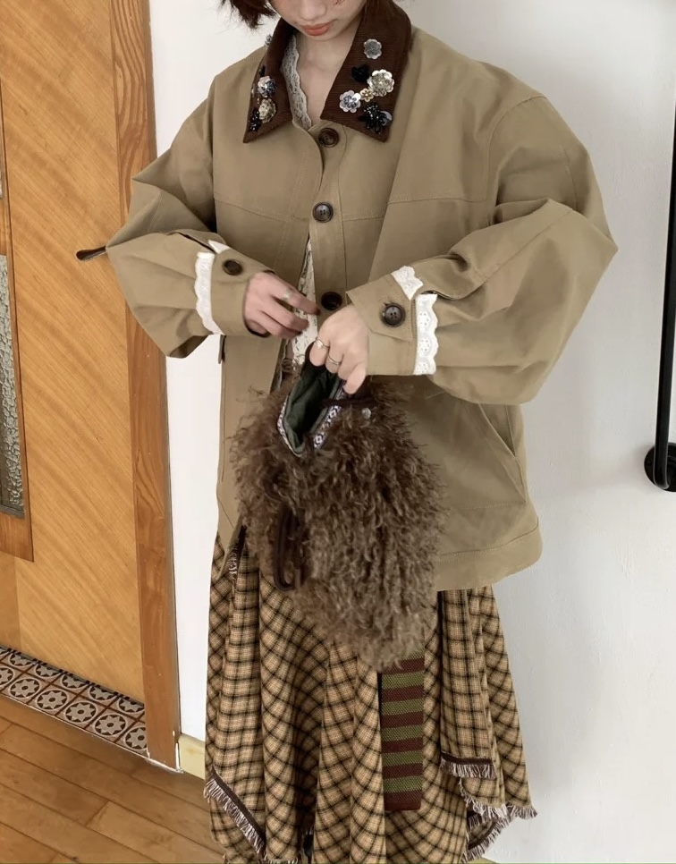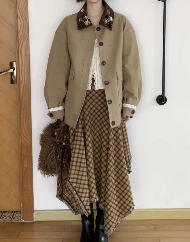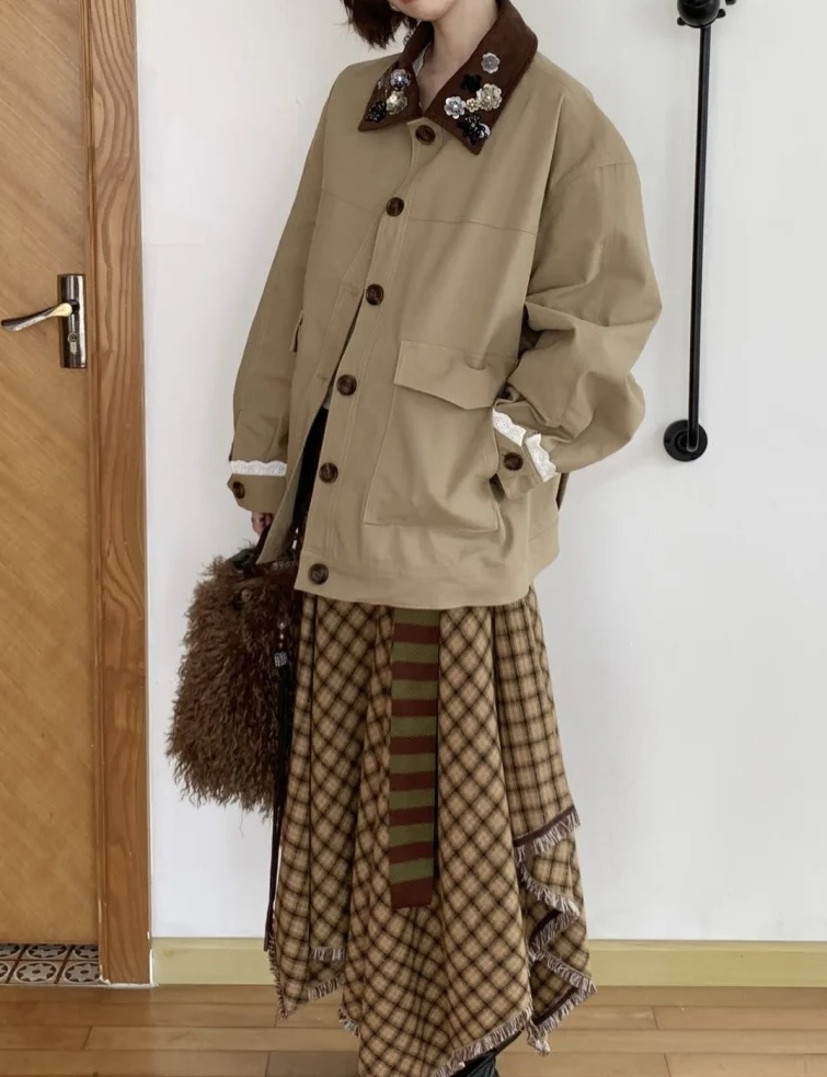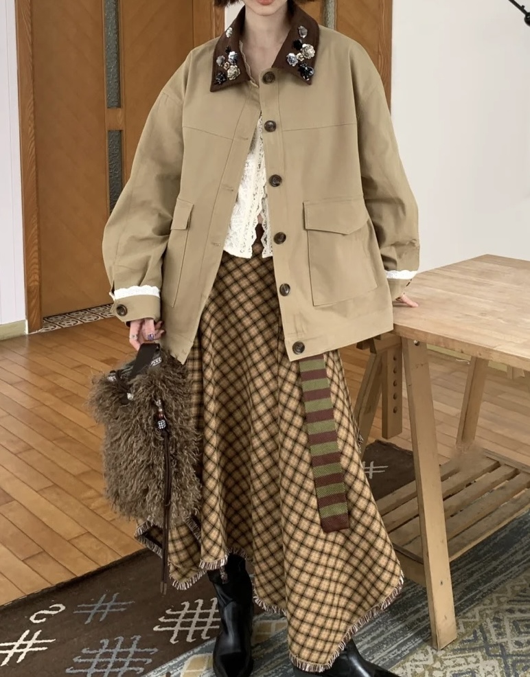 Elevate your style with this loose-fitting jacket featuring beaded detailing and a unique lapel design. Perfect for a casual yet fashionable look.