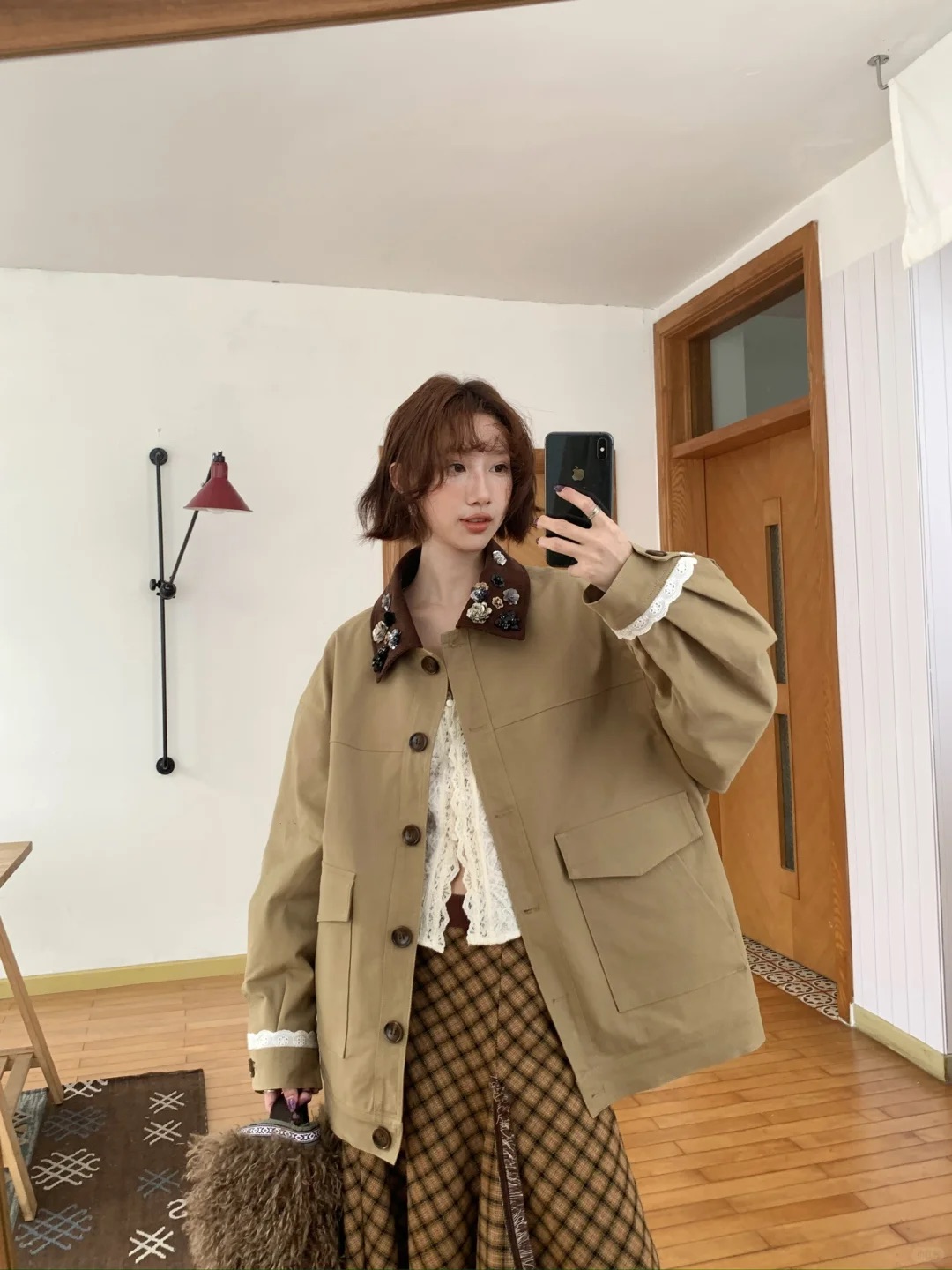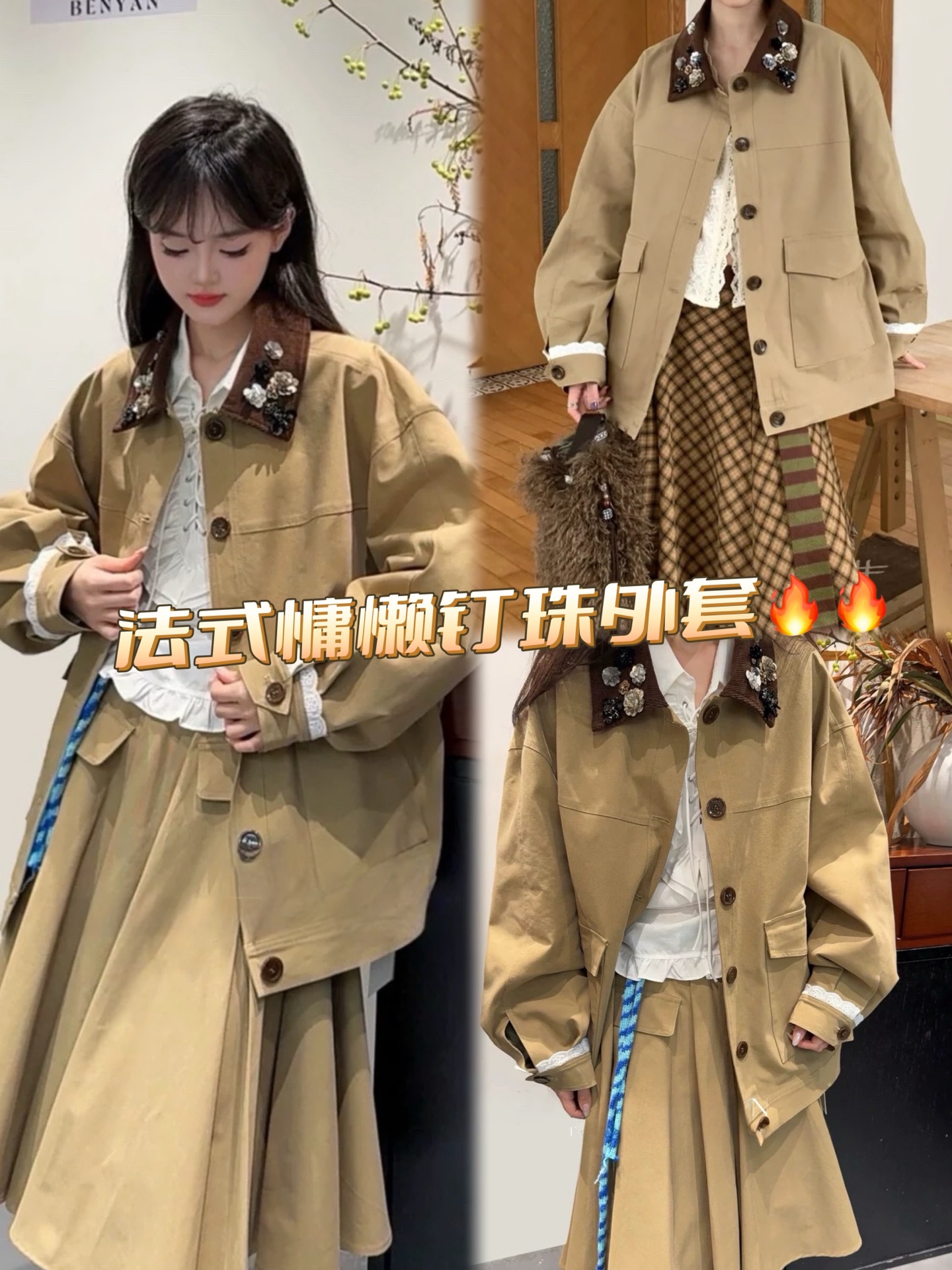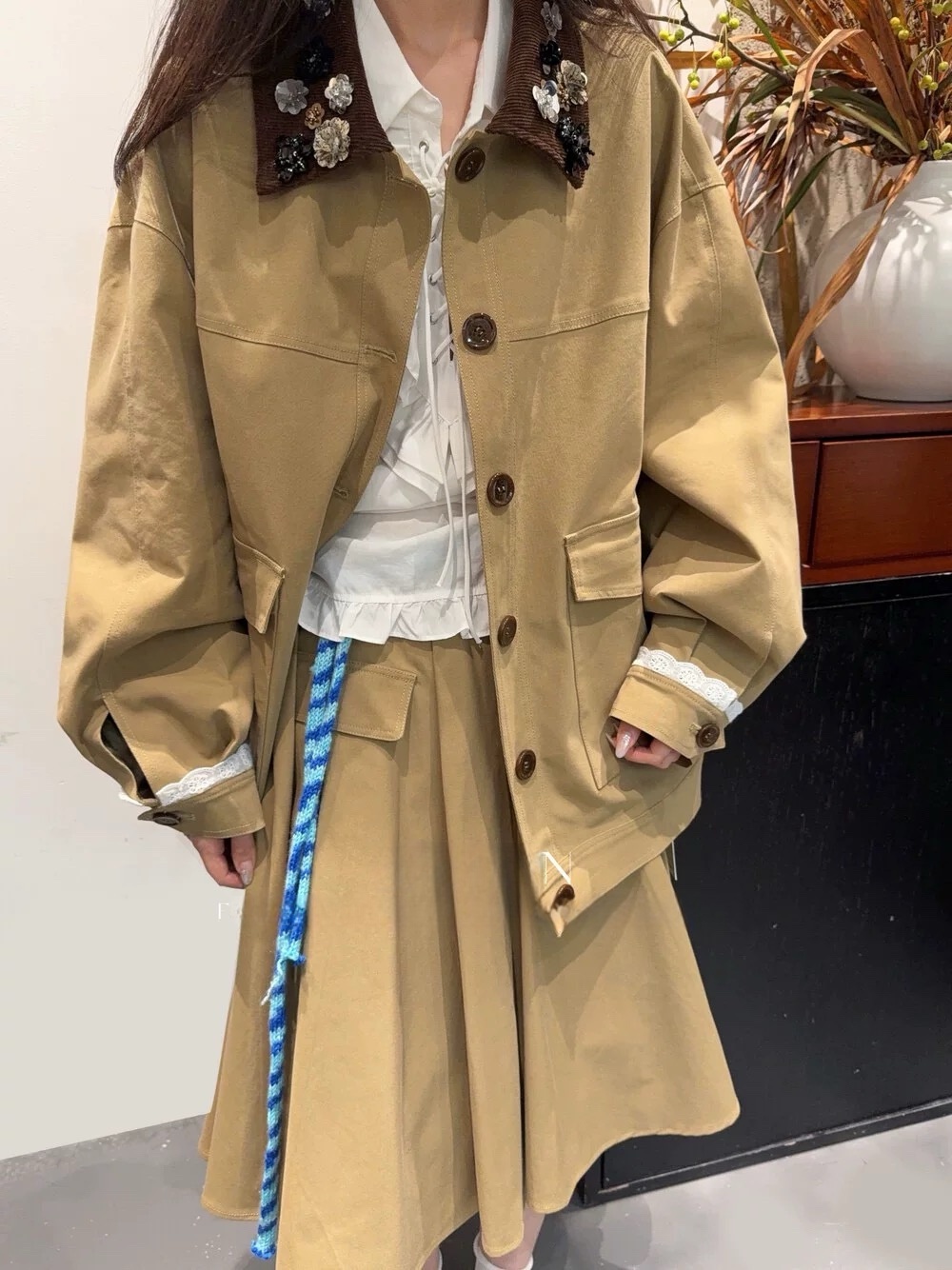 Elevate your style with this loose-fitting jacket featuring beaded detailing and a unique lapel design. Perfect for a casual yet fashionable look.