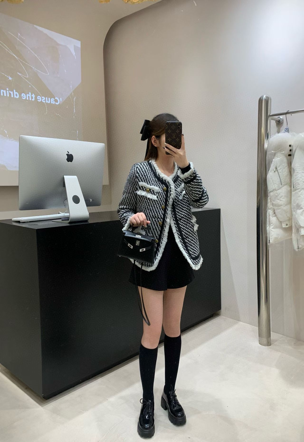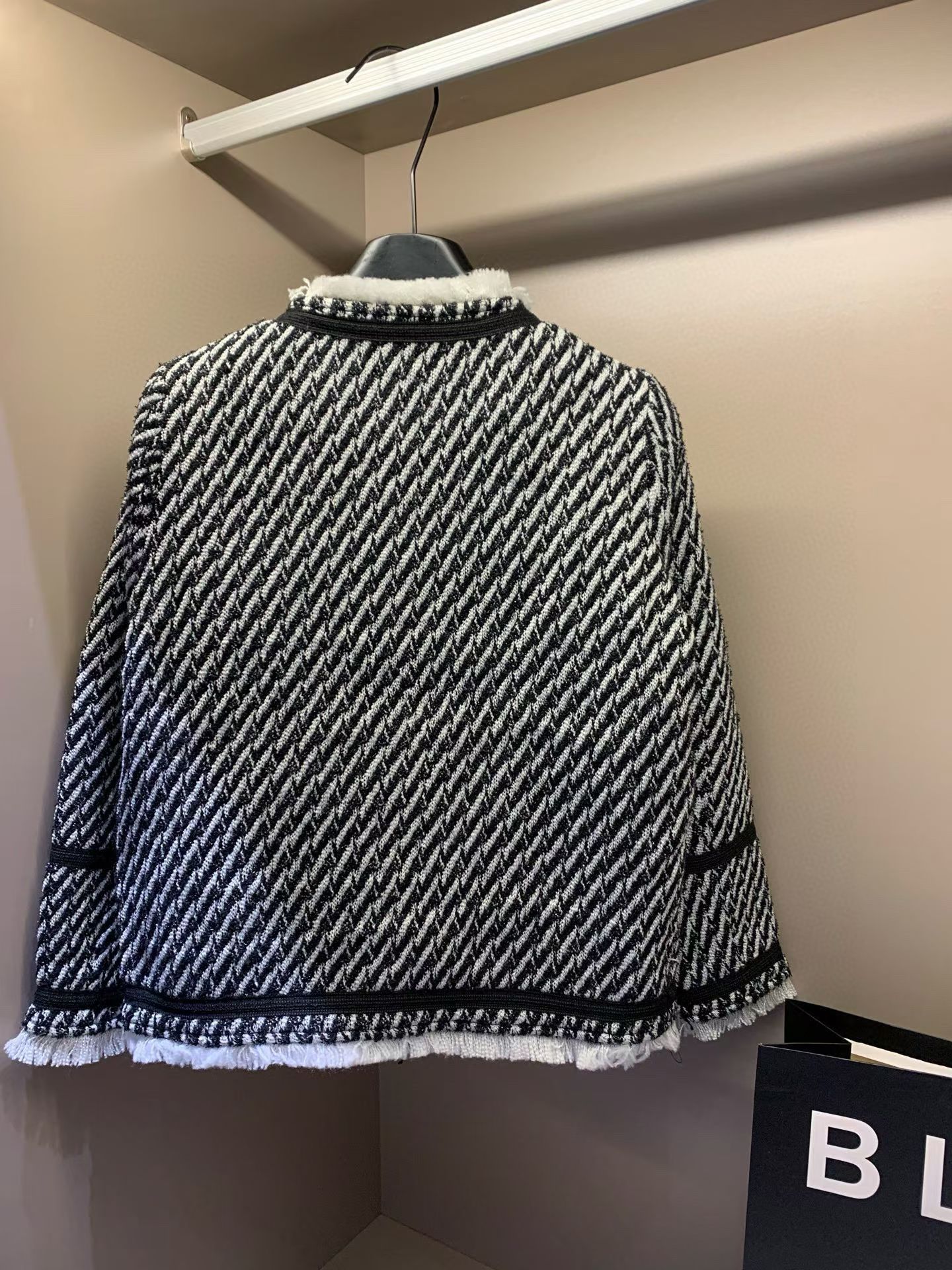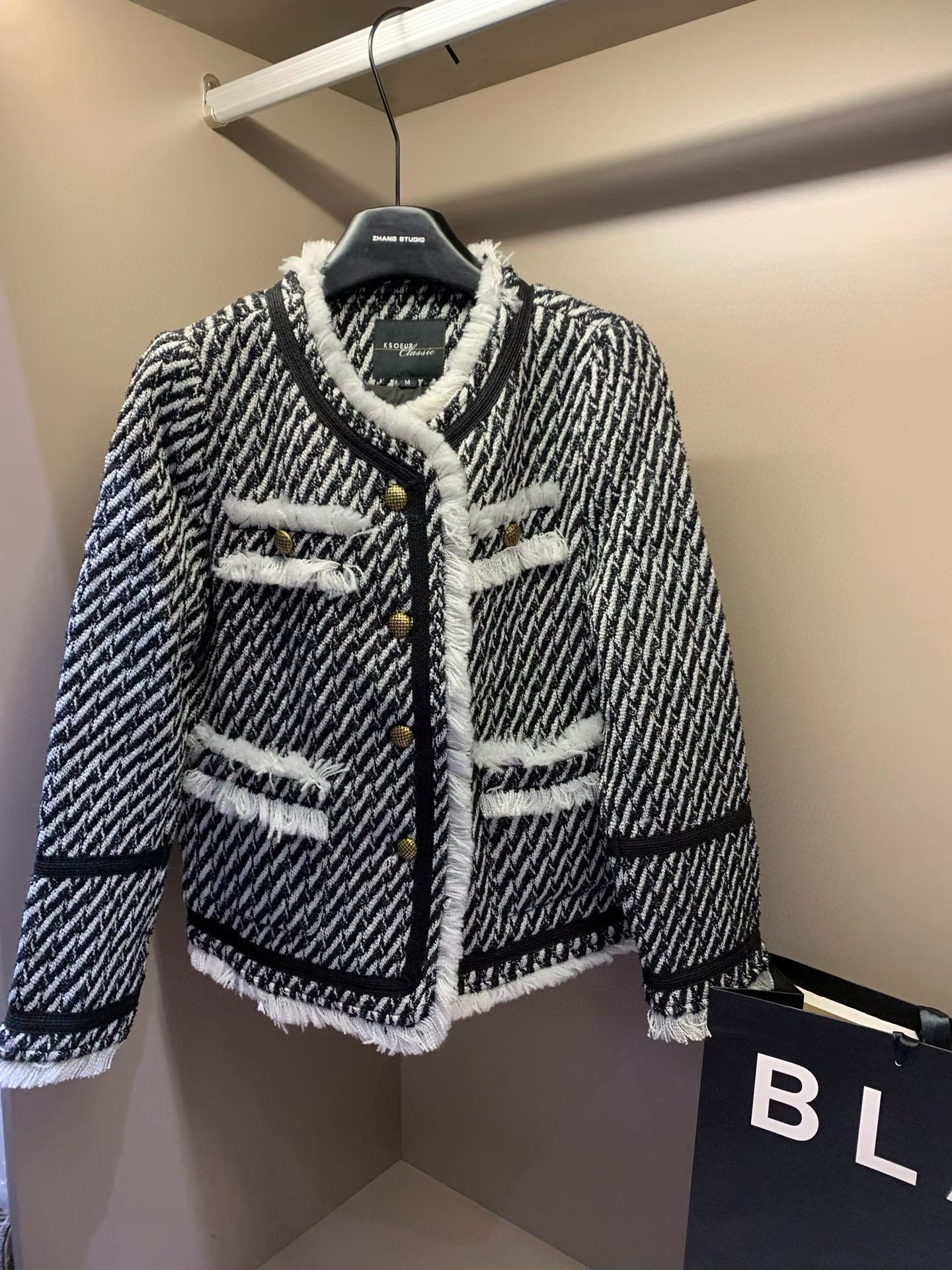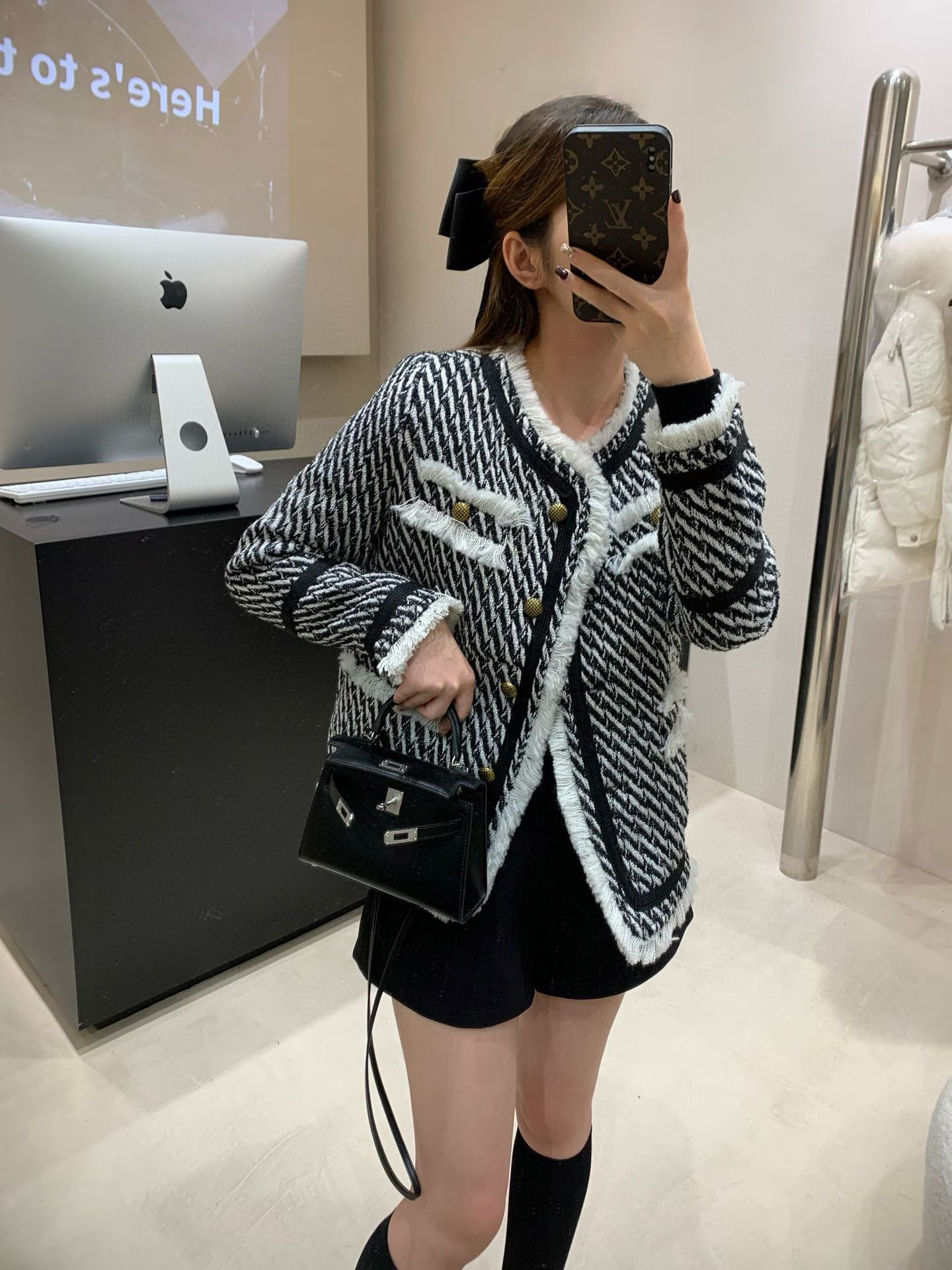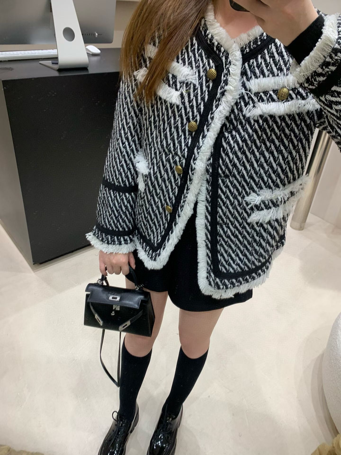 This tweed jacket combines classic style with modern comfort. The timeless herringbone pattern and delicate fringe trim make it a standout piece for any wardrobe.