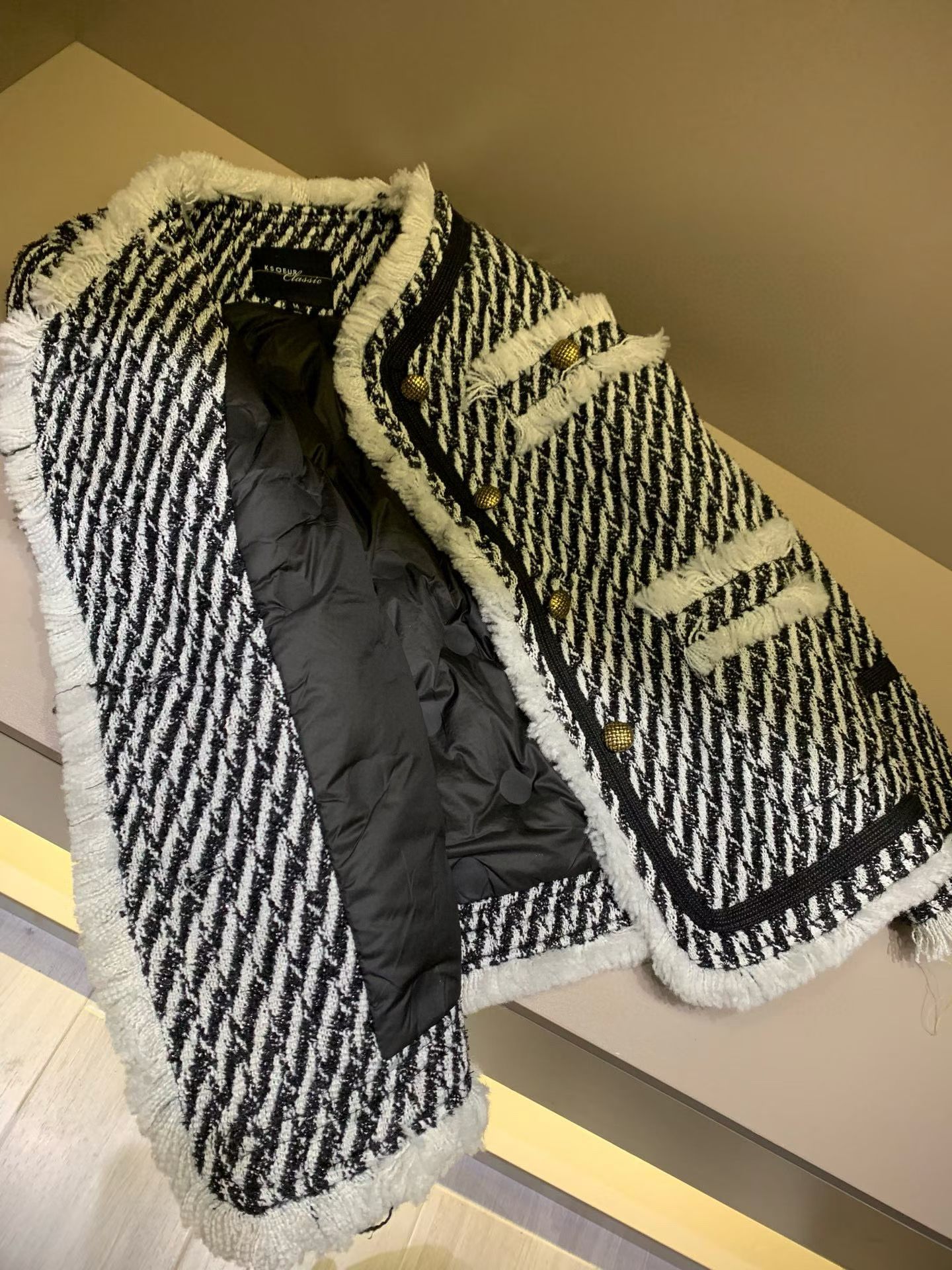 Elevate your style with this tweed jacket, crafted with a classic herringbone pattern and filled with 90% white duck down for cozy warmth.