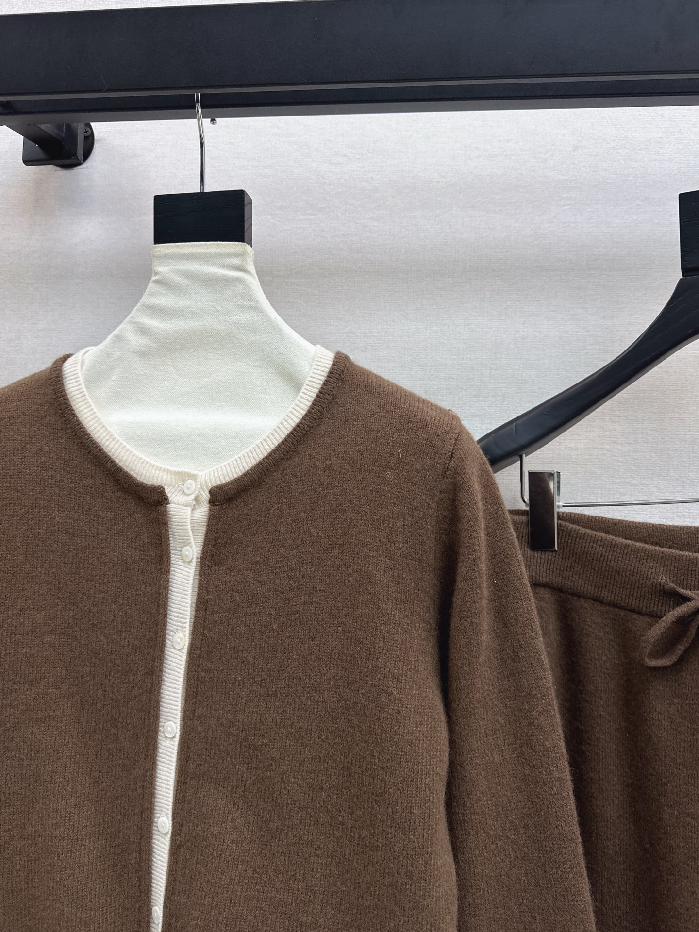 Elevate your wardrobe with this minimalist knit set. Features a color-blocked cardigan and straight-leg pants for effortless style.