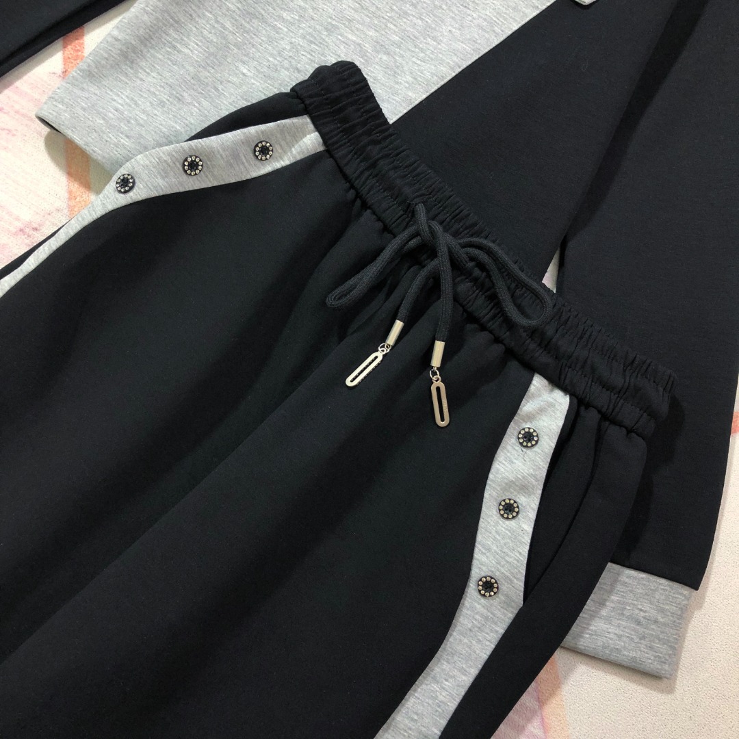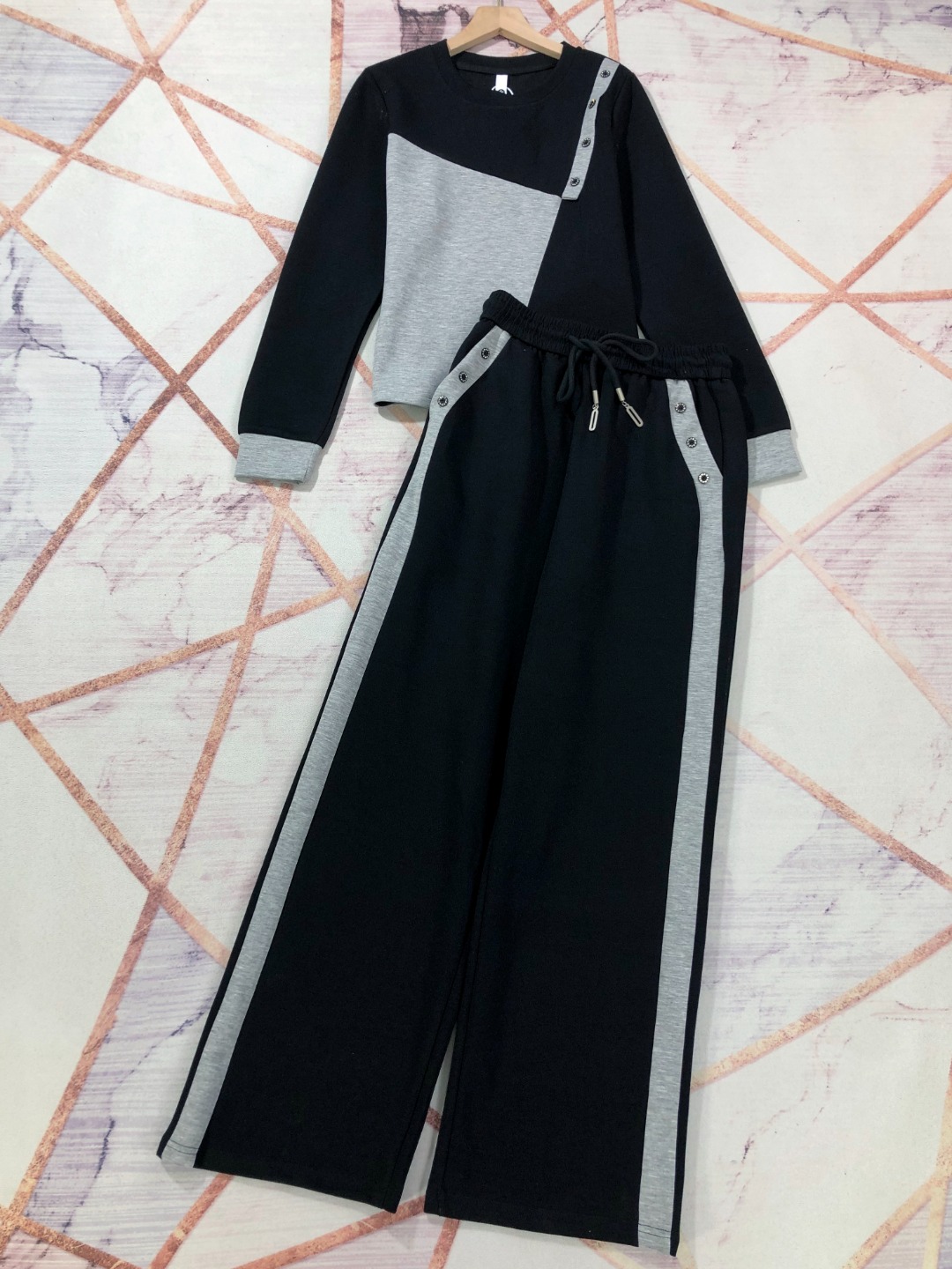 - Stylish Design: Features a unique color block design on the sweatshirt and contrasting stripes on the pants.