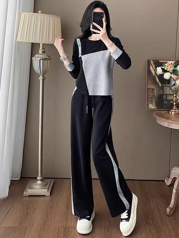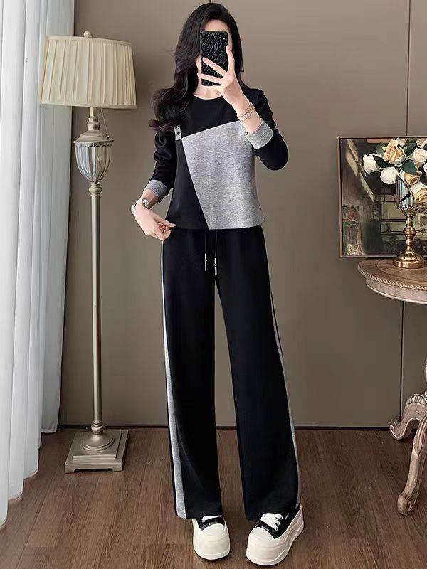 This two-piece outfit set is a stylish and comfortable choice for any modern woman. The set includes a long-sleeve sweatshirt and a pair of wide-leg pants, perfect for creating a fashionable and relaxed look.
