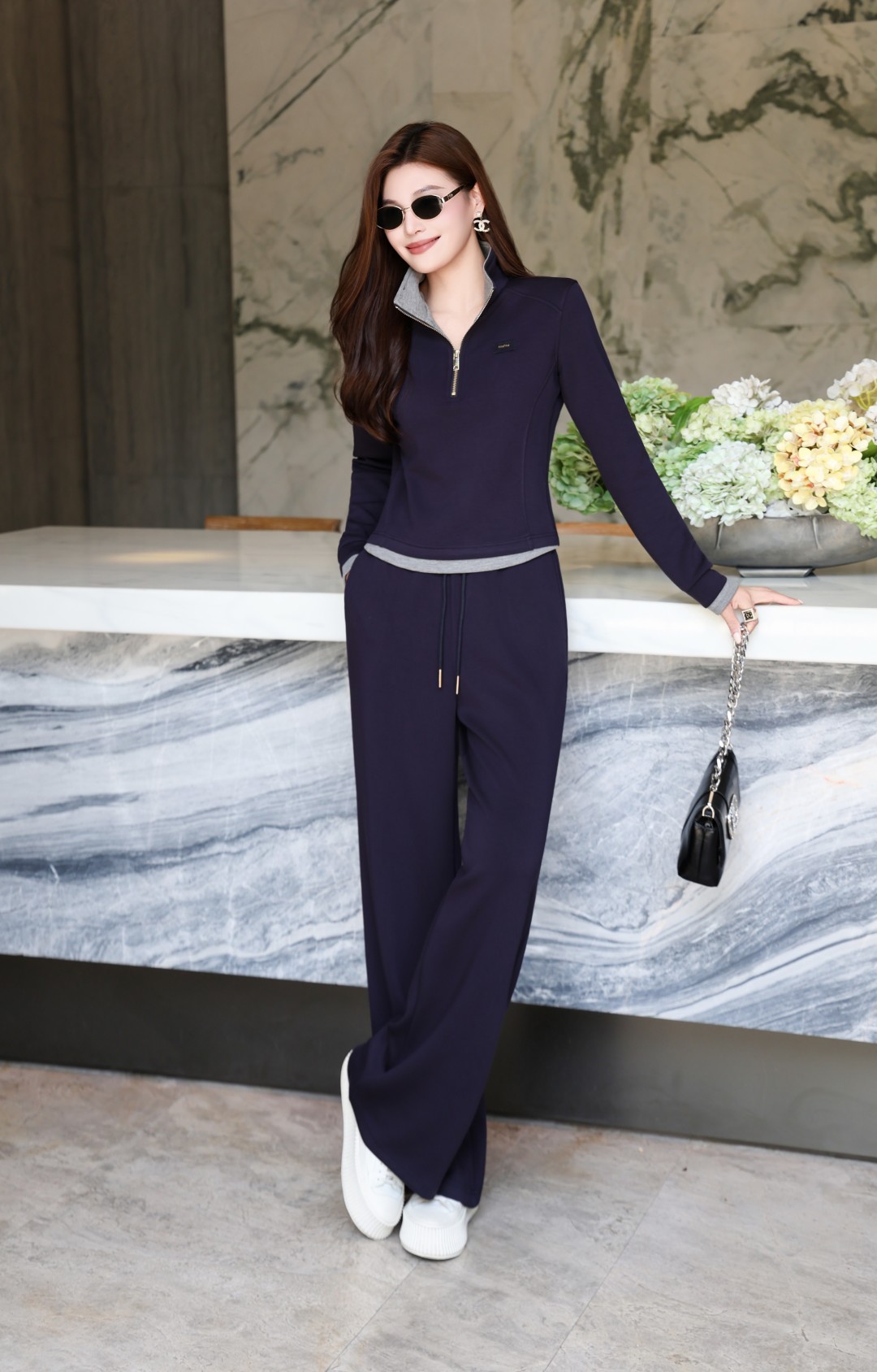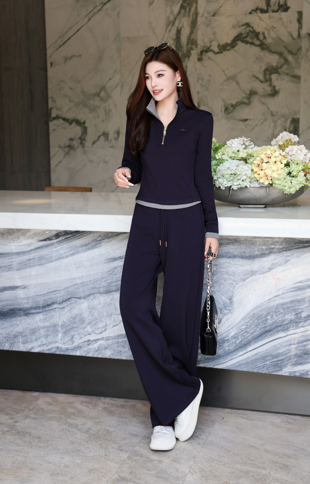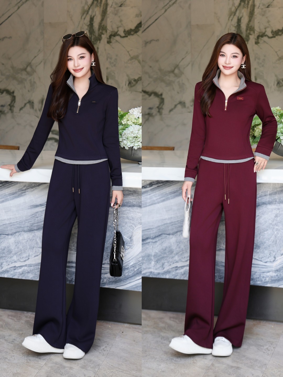 This fashionable women's sportswear set is designed for both comfort and style. Perfect for various occasions, this set includes a trendy half zipper pullover and a pair of flattering wide-leg pants.