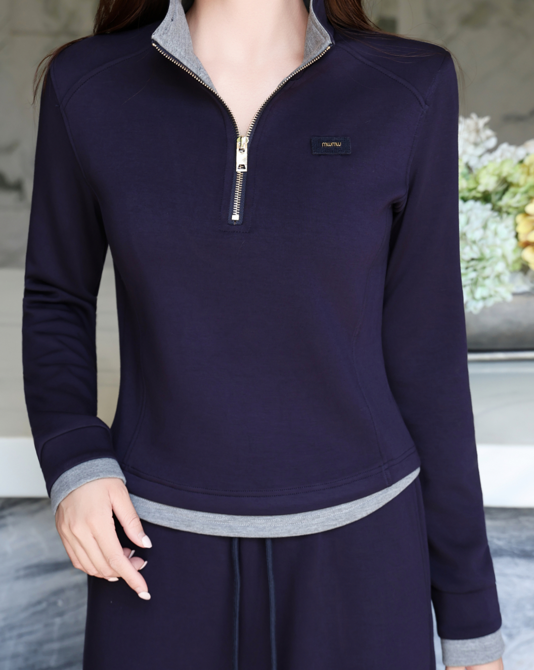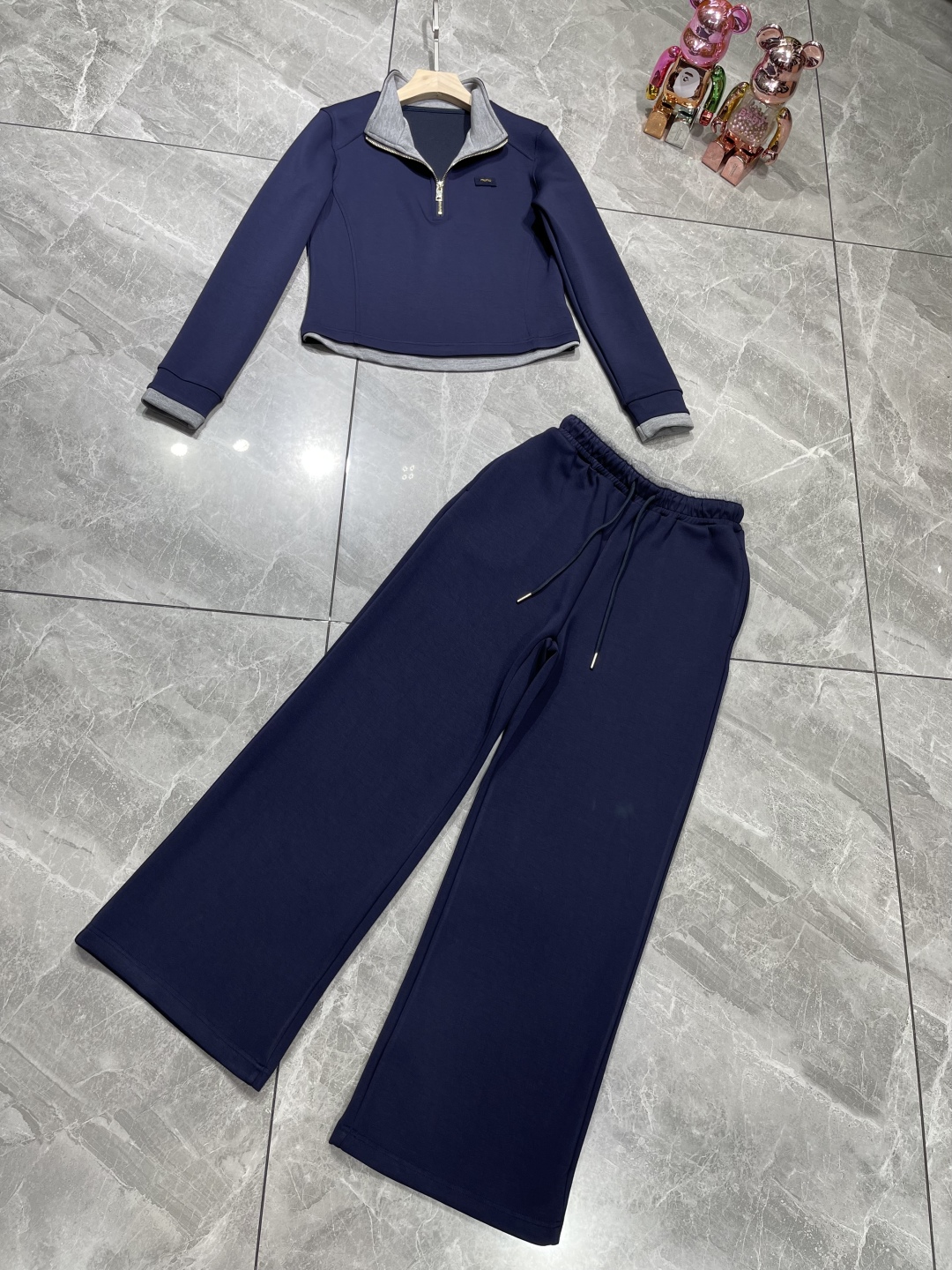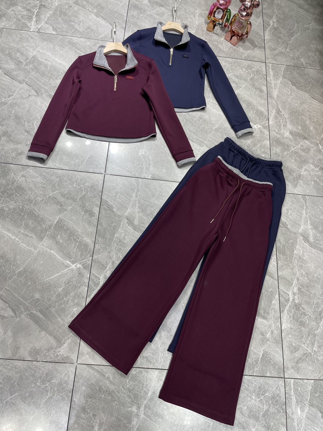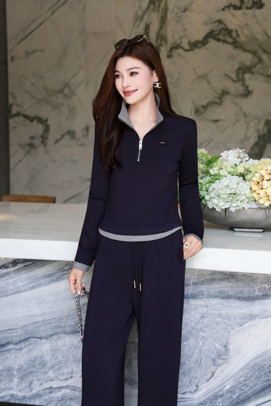 This fashionable women's sportswear set is designed for both comfort and style. Perfect for various occasions, this set includes a trendy half zipper pullover and a pair of flattering wide-leg pants.