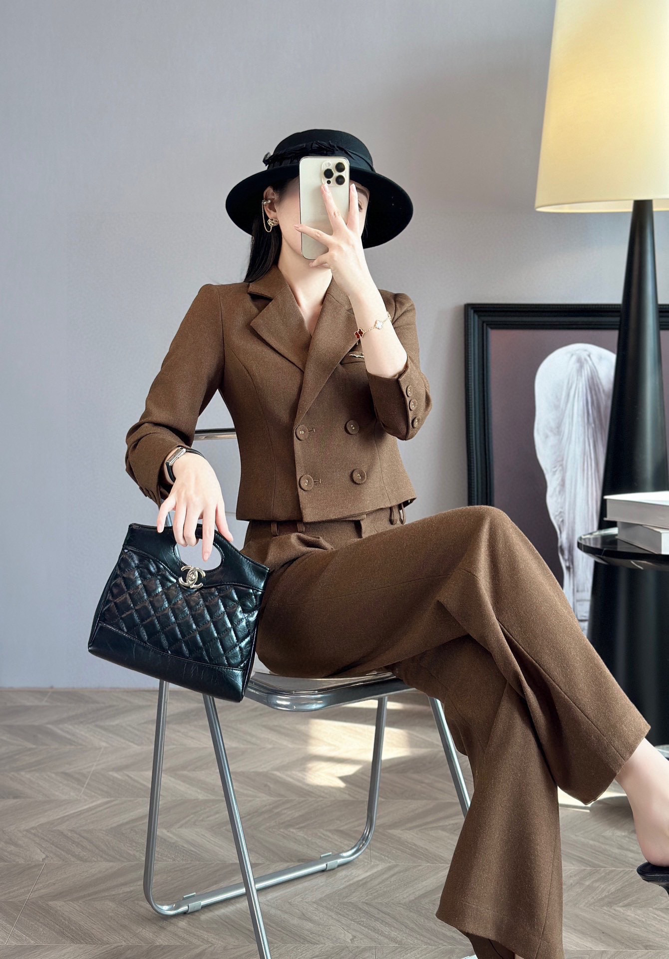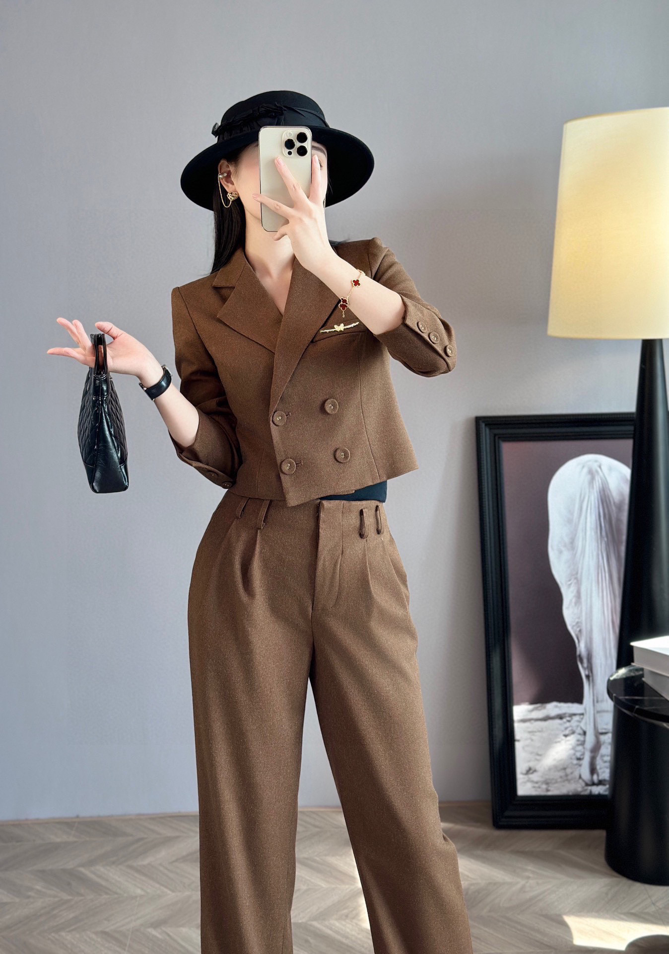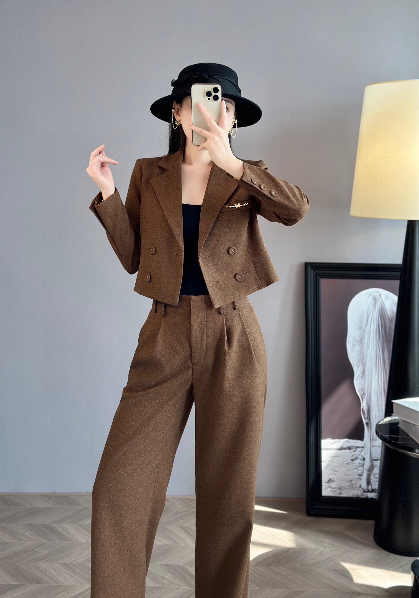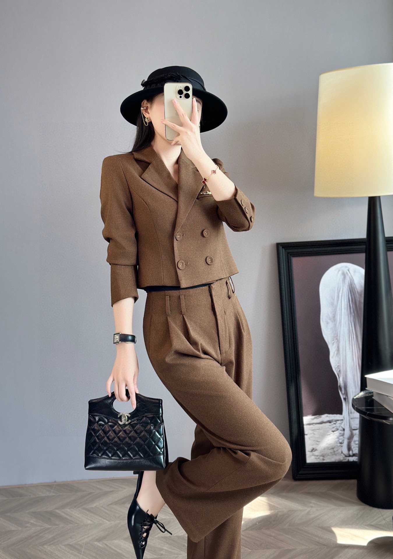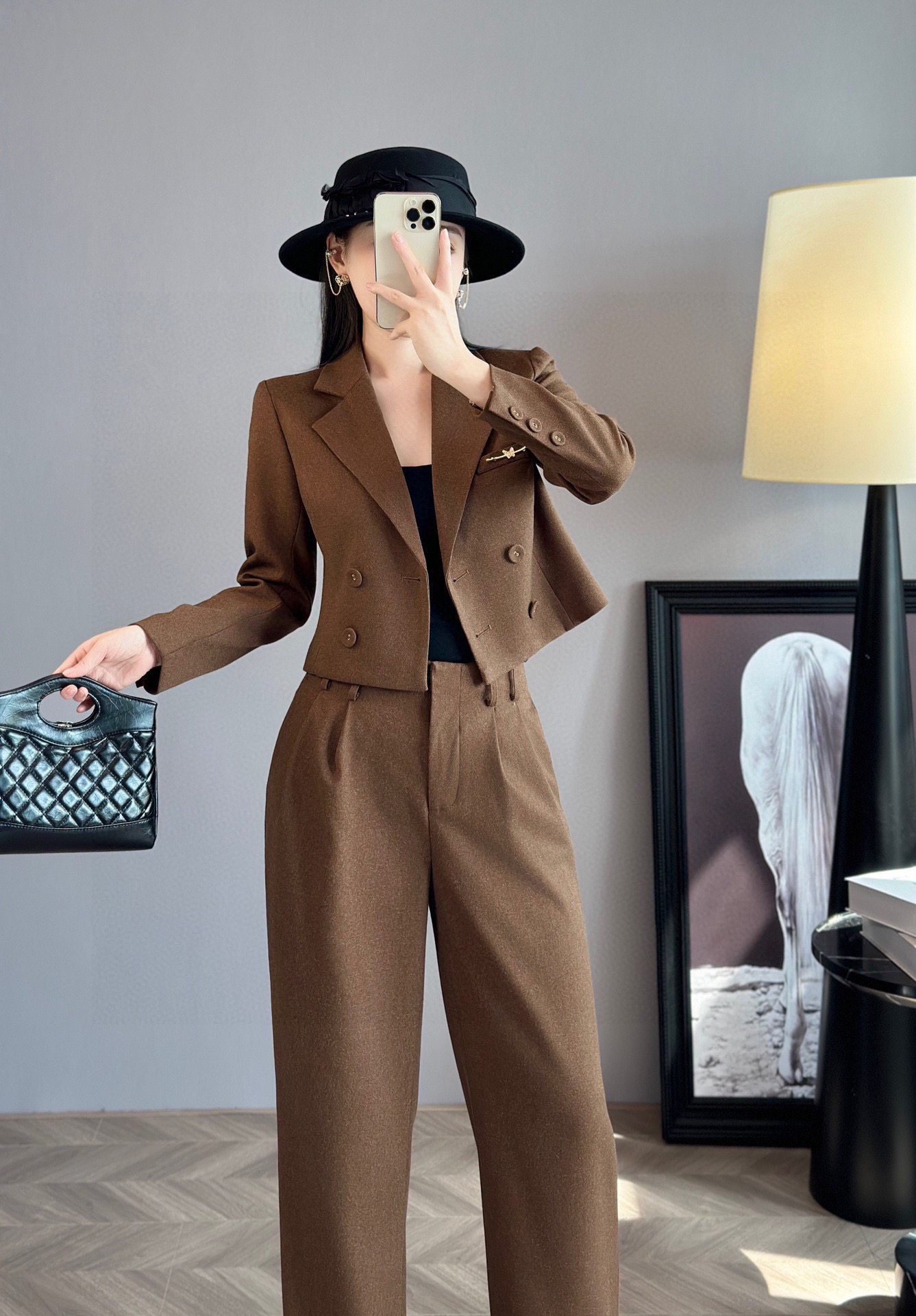 This sophisticated suit set is designed to bring a touch of Korean elegance to your wardrobe. The ensemble includes a tailored blazer and flowing wide-leg pants, perfect for making a stylish statement.