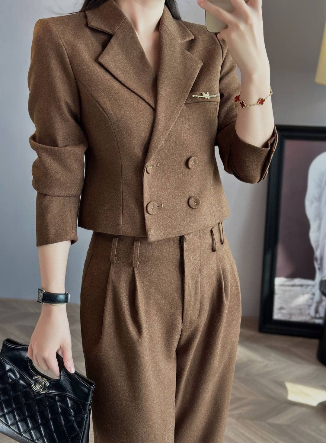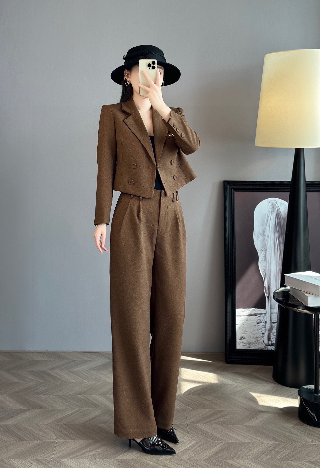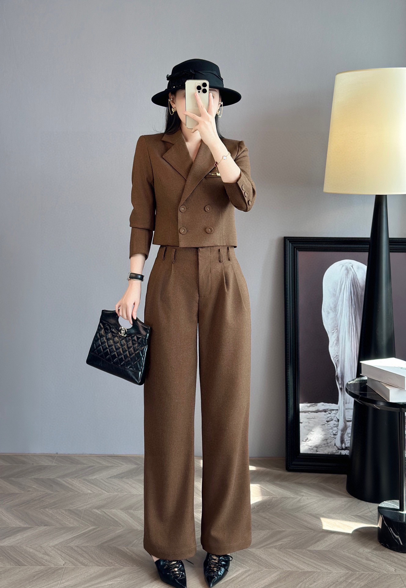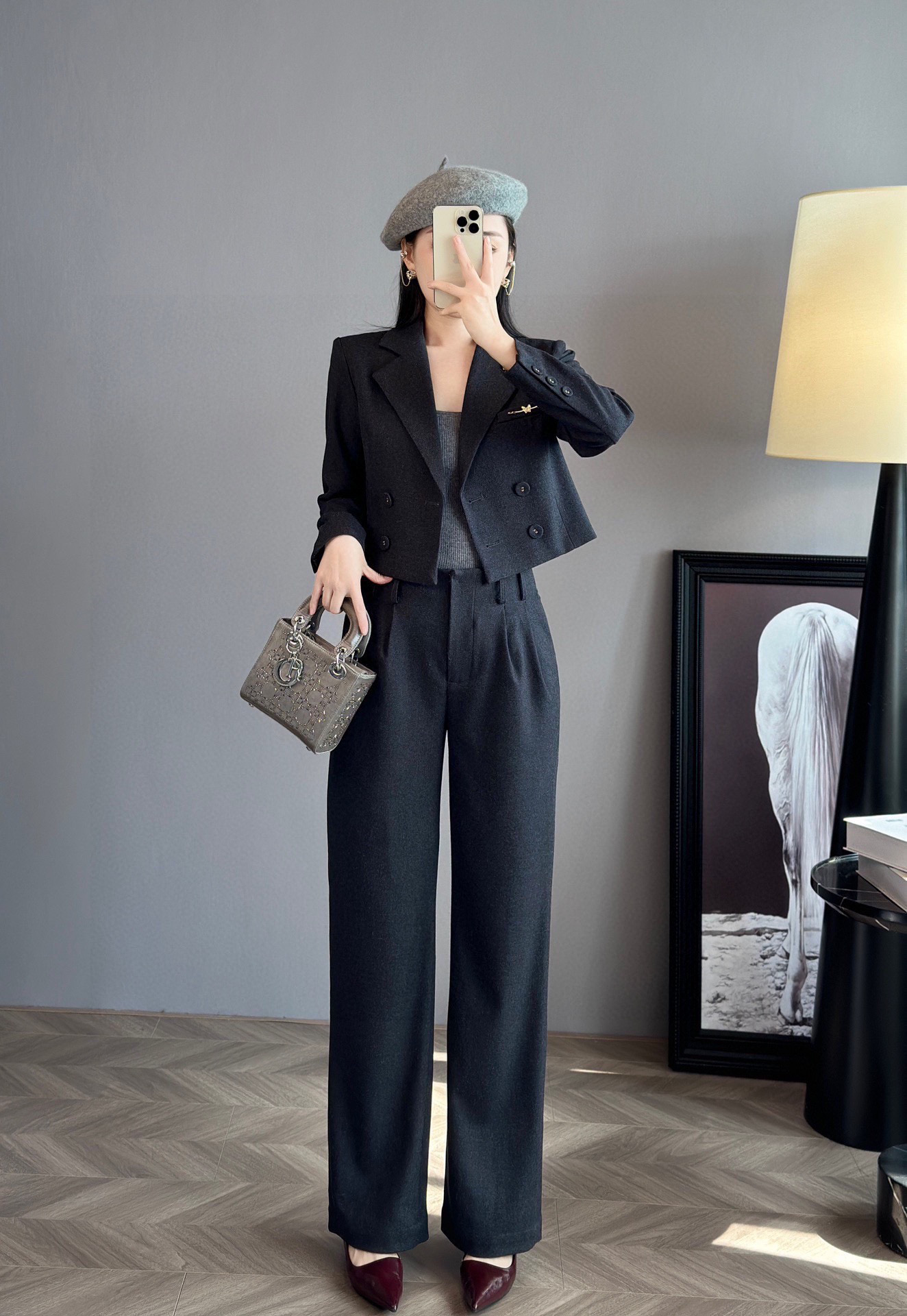 Elevate your wardrobe with this chic Korean-style suit set. Crafted from a soft wool blend, this set features a slim-fit blazer and flattering wide-leg pants.