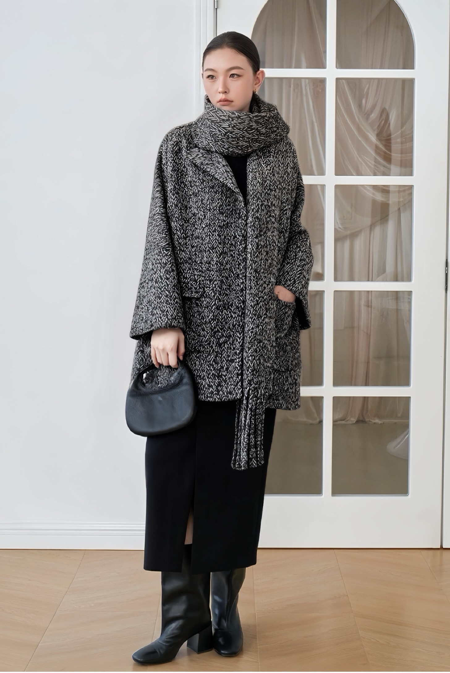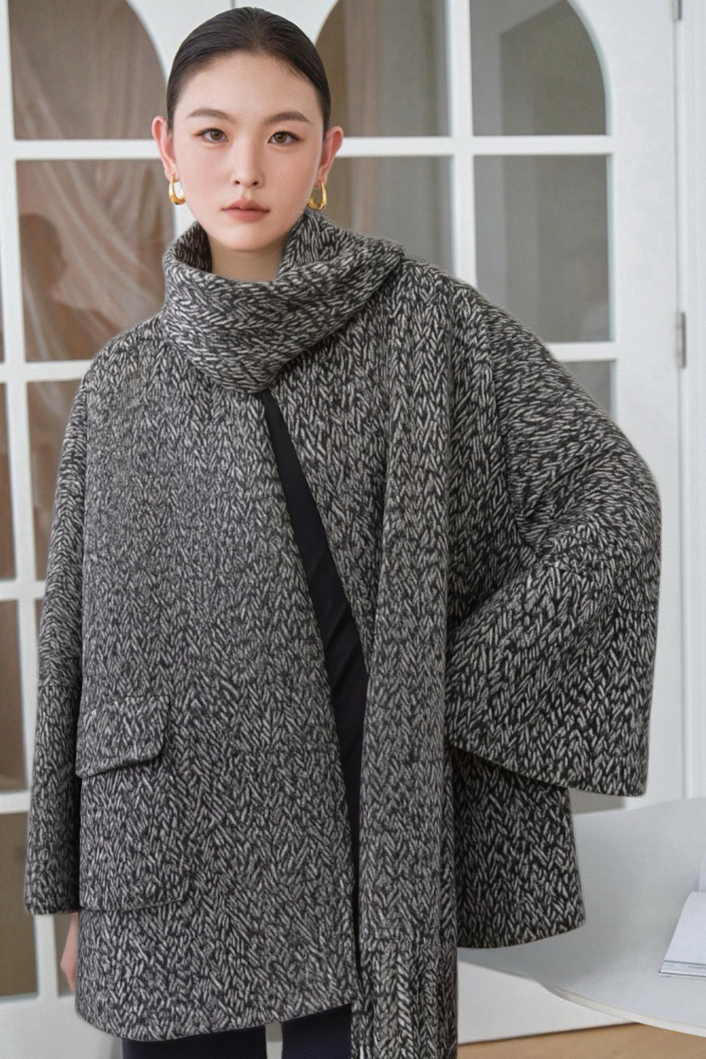 Wool Blend Herringbone Scarf Coat, Warm Winter Outerwear with Pocket Details