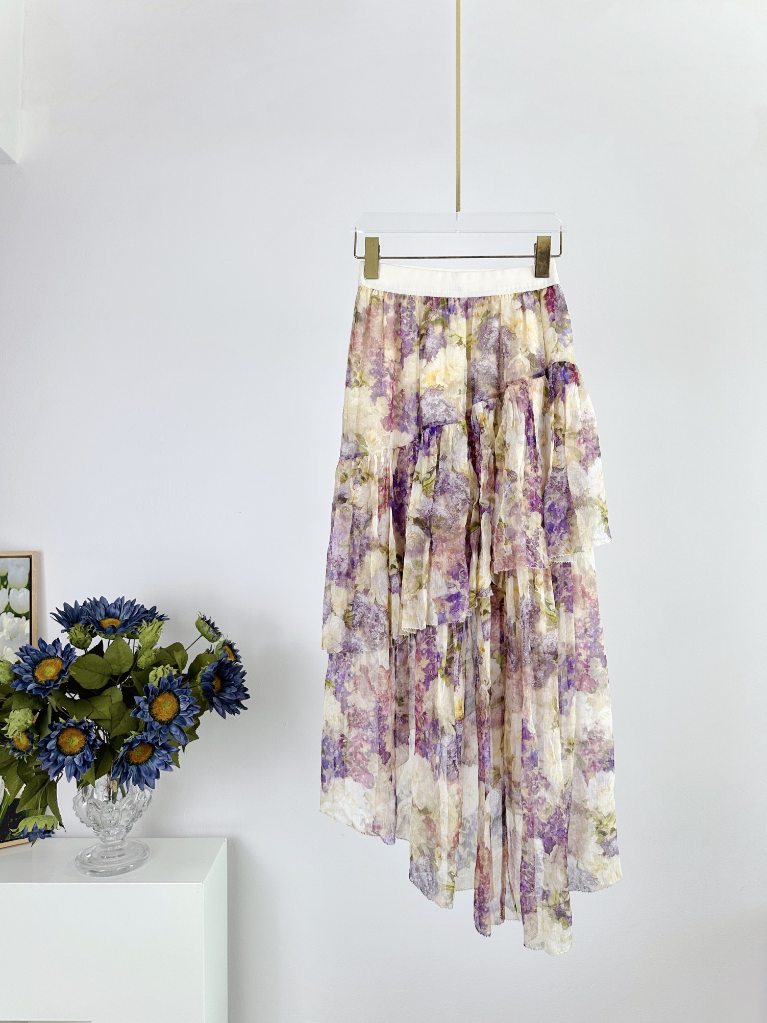 Elevate your wardrobe with this Zimmermann midi skirt. Featuring a high waist, floral print, and asymmetric hem. Crafted from 100% silk chiffon.